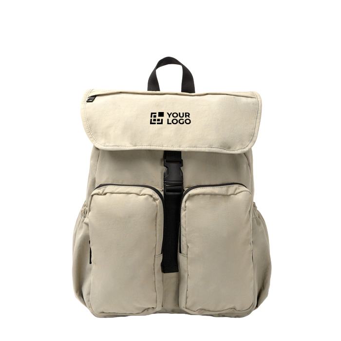 Mochila de nylon macio, pensada para o uso diário em empresa e para deslocações. Integra um compartimento principal amplo com fecho de cordão ajustável e batente de segurança, além de aba superior com fivela para um acesso rápido. Inclui um bolso frontal pequeno e dois bolsos frontais médios com fecho de correr para organizar carregadores, chaves ou documentação. No interior, inclui espaço para portátil até 15''. Costas e pega acolchoadas para maior conforto. Útil para ações de onboarding, feiras e equipas comerciais.