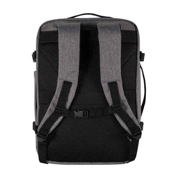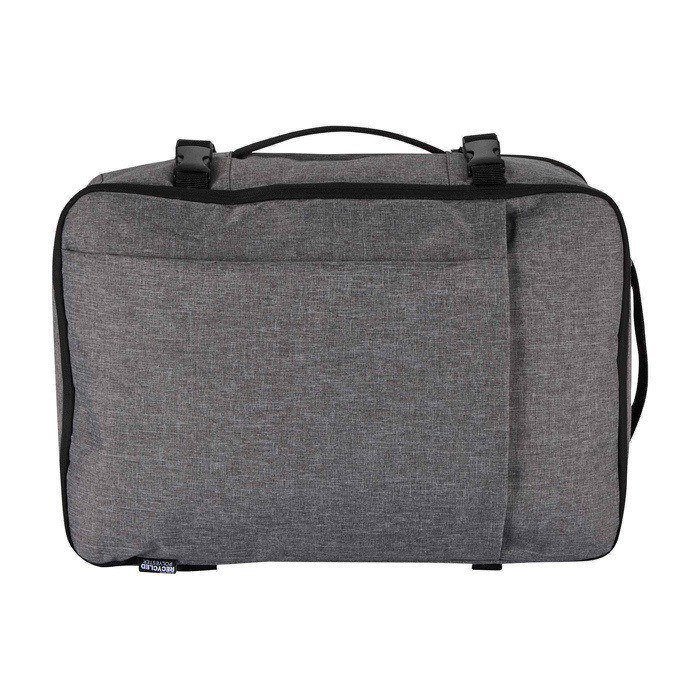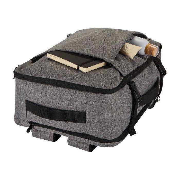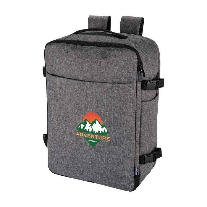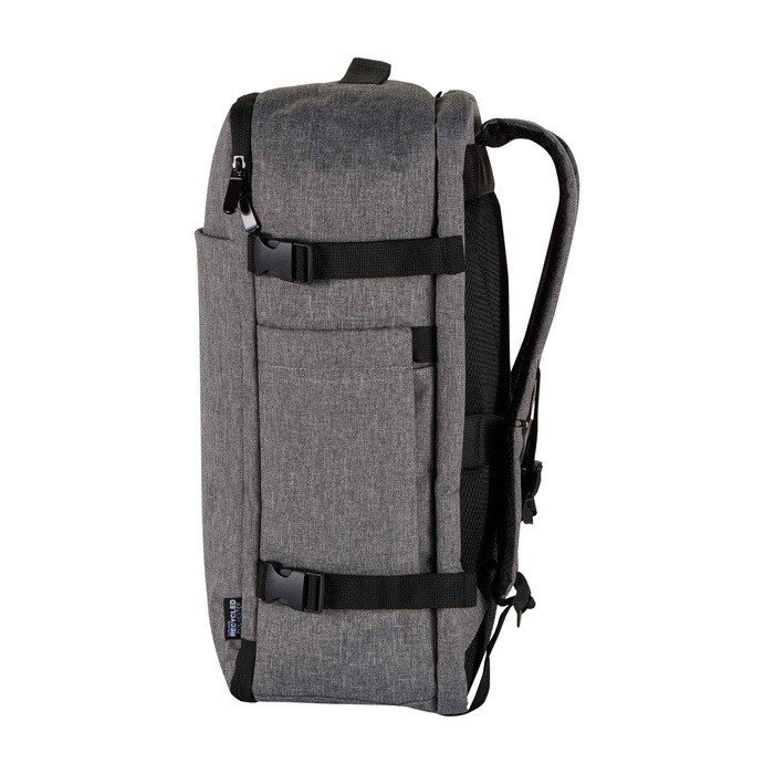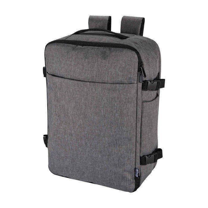 Mochila de poliéster reciclado com certificação GRS (Global Recycled Standard) e forro de plástico reciclado, concebida para viajar como bagagem de mão na maioria das companhias aéreas. Dispõe de compartimento para portátil até 17” e secção principal ampla com alças elásticas e divisores de malha para organizar roupa e acessórios. Inclui dois bolsos frontais com fecho de correr para o indispensável, painel traseiro transpirável e manga para trolley. Útil para viagens de negócio, teletrabalho ou eventos corporativos.