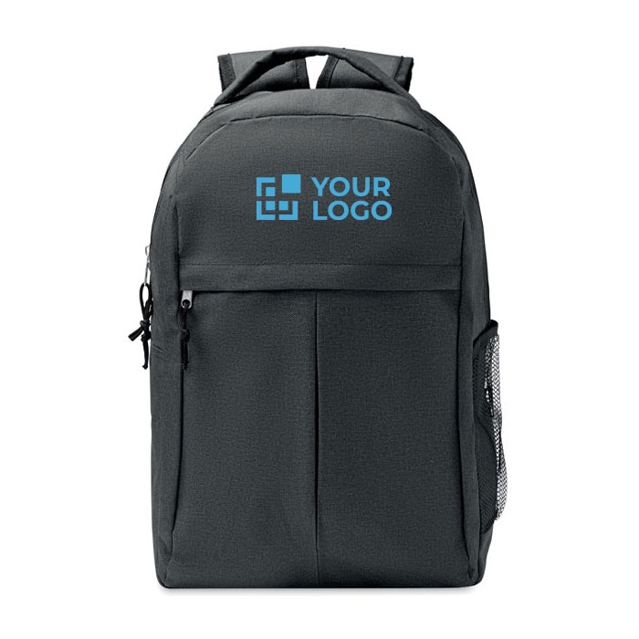Faça com que os seus trabalhadores e clientes transmitam uma imagem séria e profissional sob o seu selo. E é que com esta mochila de poliéster 600D RPET personalizada, a sua marca se posicionará como referência em elegância e corporativismo. Apresenta-se sob um design em preto mesclado, com alças ajustáveis e pega superior. Além disso, conta com um bolso lateral de rede e um bolso exterior com fecho de fácil acesso. Personalize-a com a técnica que melhor se encaixe com os seus valores empresariais e receba-a em tempo recorde graças ao nosso serviço de transporte rápido!