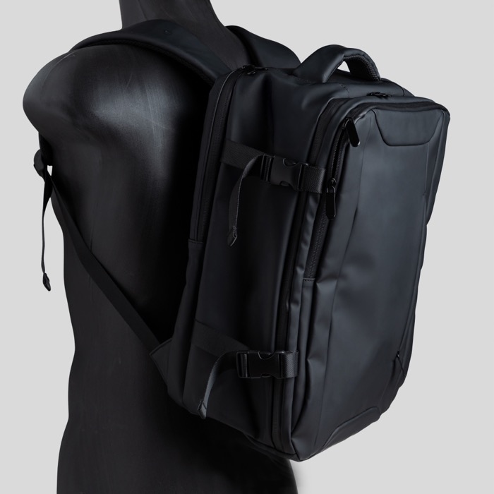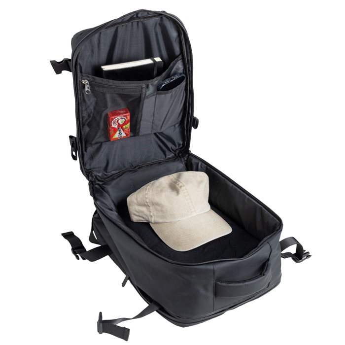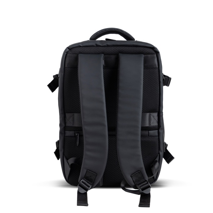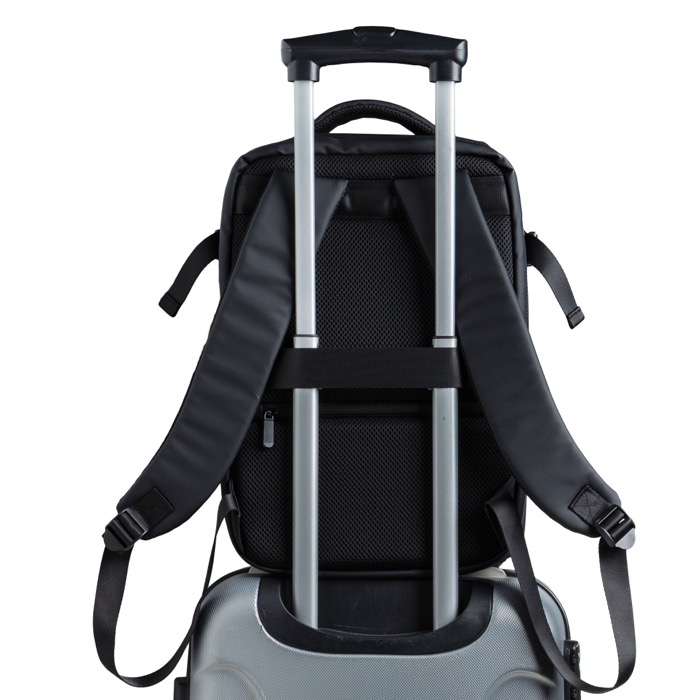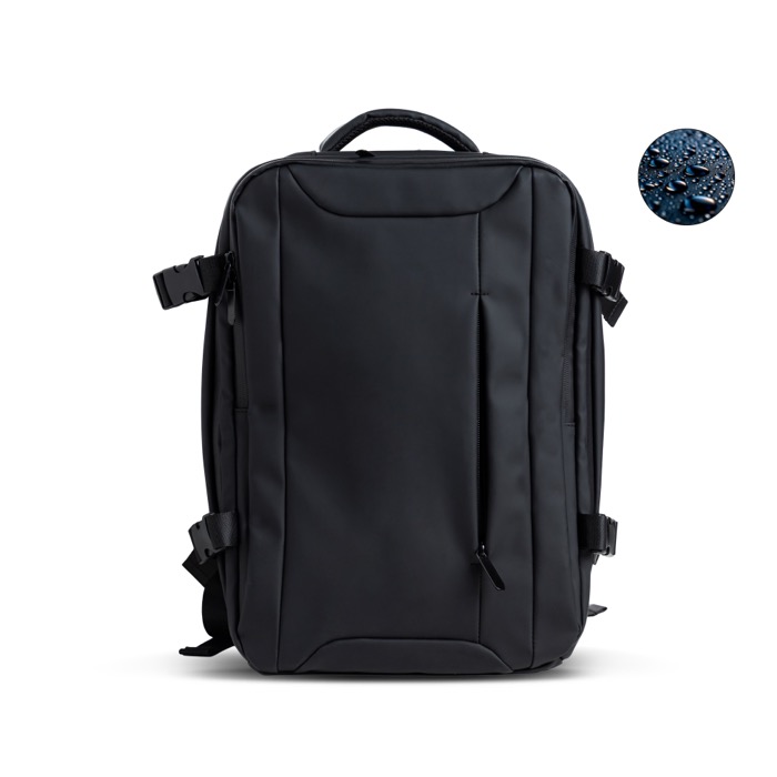 Mochila em pele sintética resistente com design extensível tipo under the seat para ganhar capacidade quando precisar. Inclui um bolso antirroubo para proteger objetos de valor e compartimentos independentes que ajudam a organizar o dia a dia. Inclui um espaço impermeável para roupa ou acessórios e um compartimento almofadado para portátil até 15,6'', além de fechos resistentes à água para maior proteção. Opção prática para ações de marca em viagens empresariais, eventos ou uso diário no escritório.