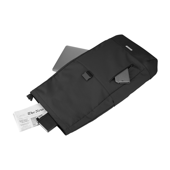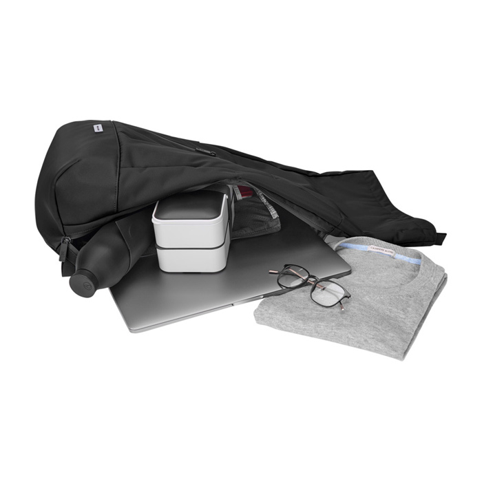 Mochila roll-top de estilo urbano contemporâneo. Dispõe de um compartimento com fecho roll-top, um bolso lateral com fecho de correr para facilitar o acesso, malha respirável na parte posterior para maior conforto e frescura, um bolso frontal, uma fita para bagagem para viagens longas, apito de emergência, alças de ombro acolchoadas e um bolso exterior plano aberto. No interior, tem dois bolsos seguros com fecho de correr e um bolso para notas onde pode guardar ideias. Também pode guardar em segurança um dispositivo eletrónico até 15''.