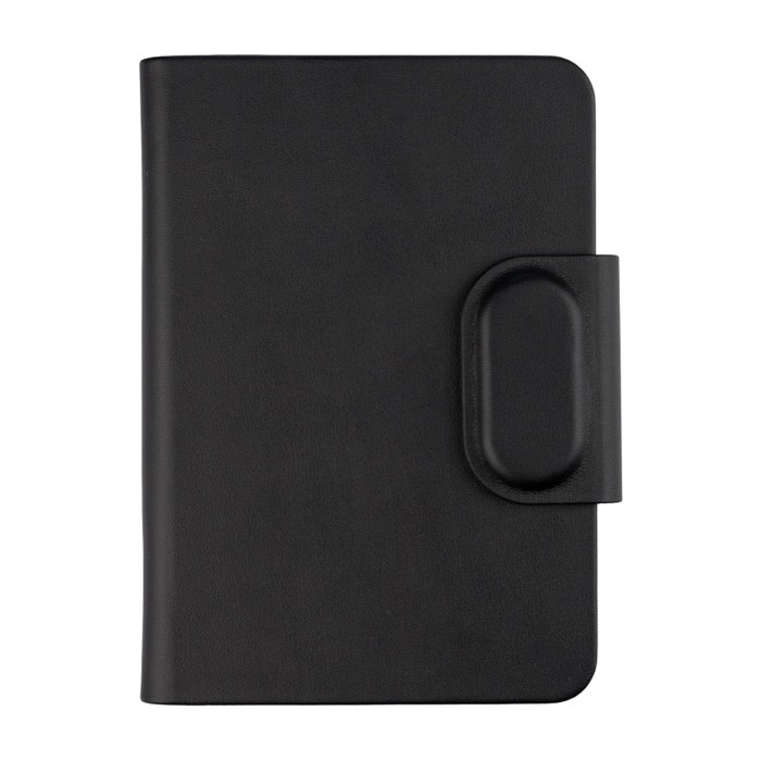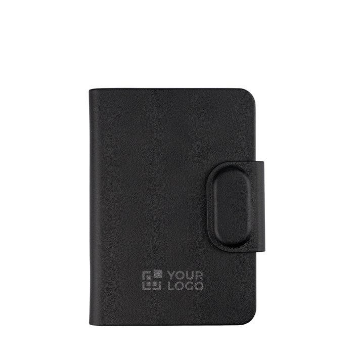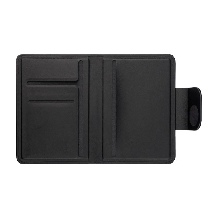 Capa para passaporte em PU reciclado com fecho magnético e localizador Apple FindMy. Organiza e protege documentos sob o logótipo da empresa.