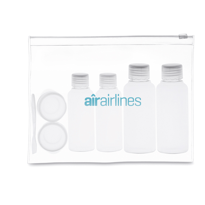Estes é um dos estojos de toilette personalizados mais completos já que incorpora seis frasquinhos no seu interior, e além disso virá personalizado com o seu logotipo.