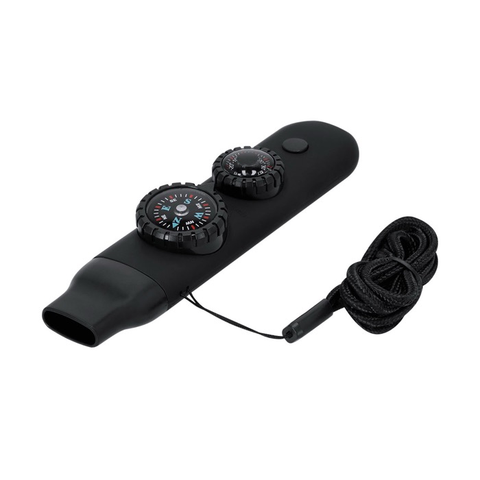 Apito de sobrevivência feito de plástico com acabamento de borracha, concebido para ter sempre à mão em excursões e atividades ao ar livre. Junta bússola, apito de alta potência, termómetro de -20 °C a 50 °C, lupa, espelho e uma lanterna com 2 LED com botão de ligar/desligar. Inclui cordão para pendurar ao pescoço e transportá-lo confortavelmente. Escolha prática para ações corporativas afetas à segurança, eventos outdoor ou formações internas.