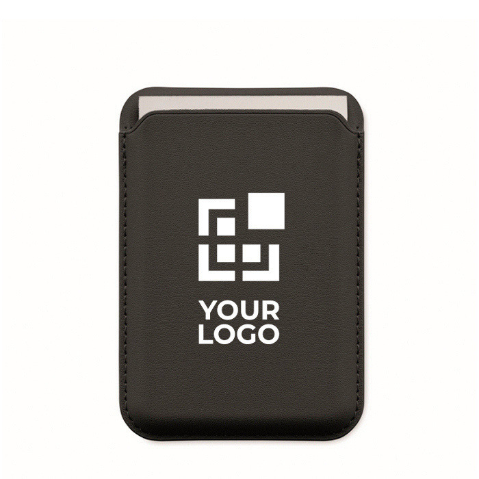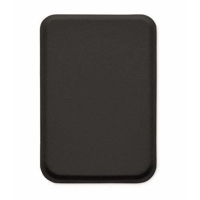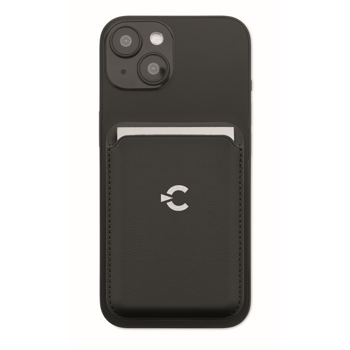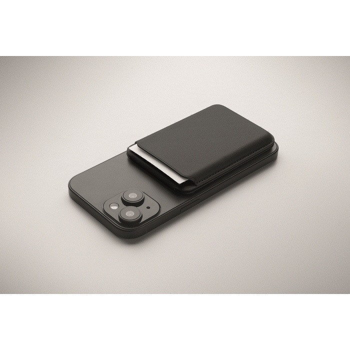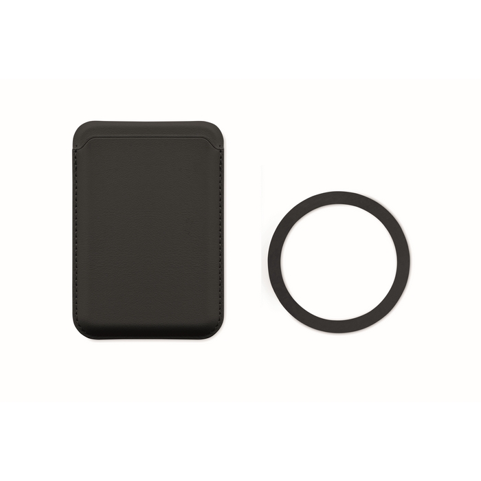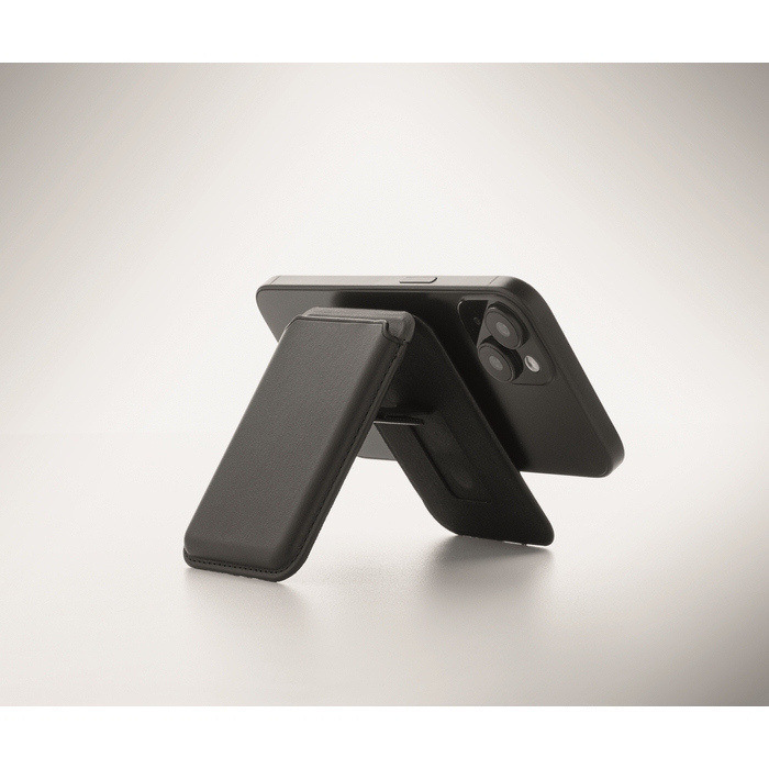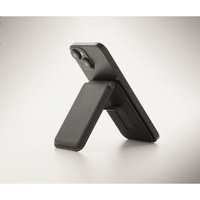 Porta-cartões magnético de polipele de PU, pensado para levar cartões de crédito de forma organizada. Tem capacidade até 3 cartões e fixa-se ao telemóvel ou outras superfícies compatíveis através da base magnética. Inclui função de suporte para apoiar o telemóvel e facilitar videochamadas ou visualização de conteúdos. Dispõe de anel metálico adicional que melhora a fixação e ajuda a manusear o dispositivo com uma só mão. Útil para ações de boas-vindas, feiras ou packs corporativos.
