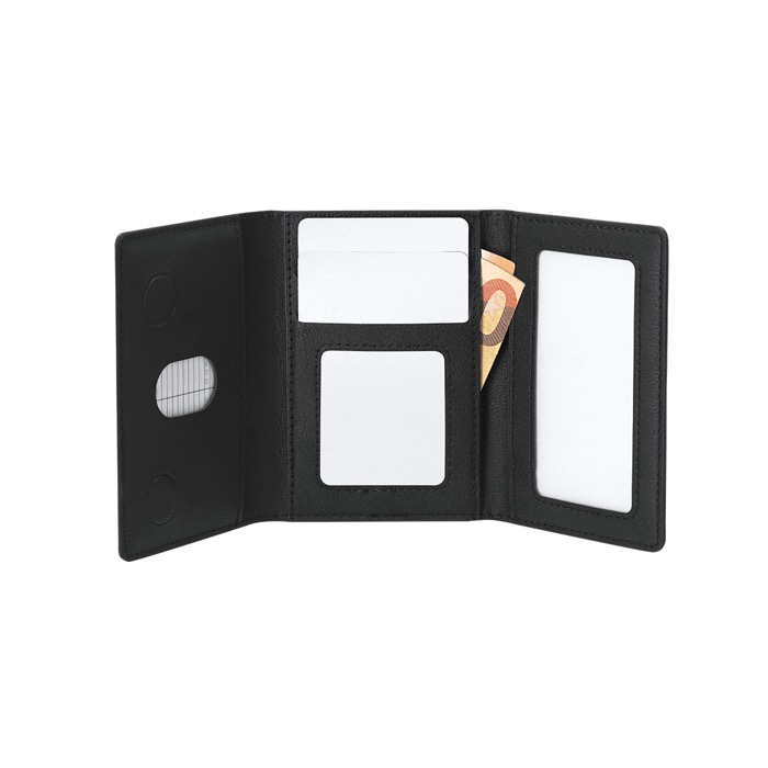 - Seis compartimentos para cartões, credenciais e notas pequenas