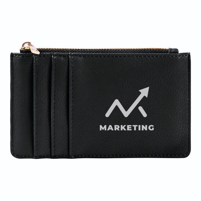 Acessório simples de couro sintético, resistente e duradouro para levar cartões e moedas. Realce a sua empresa com um brinde mais elegante.