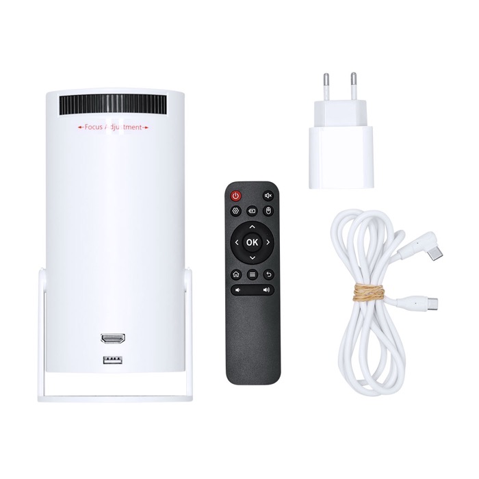 Projetor de plástico com acabamento mate e detalhes antideslizantes de silicone, pensado para oferecer projeção clara em reuniões, formações ou apresentações internas. Inclui foco manual e ângulo de rotação de 180º para ajustar a imagem de acordo com o espaço. Suporta resolução até 1080p e dá para conteúdo 2K e 4K mediante entrada HDMI. Inclui colunas de 3 W e ligações HDMI, USB-A, USB Tipo-C e saída de áudio jack 3,5 mm para reproduzir vídeo, áudio e fotos em distintos ambientes corporativos.