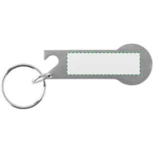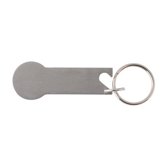Simples, económico mas muito prático. Este porta-chaves personalizado de aço inox pode servir como moeda para carrinho de compras e tem função de abre-caricas.