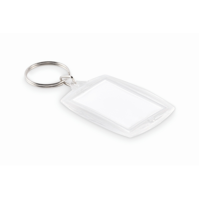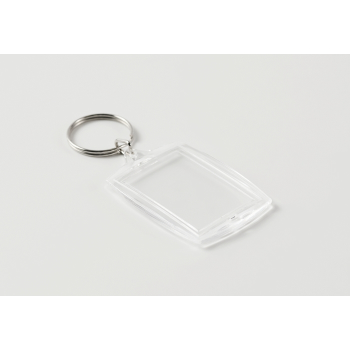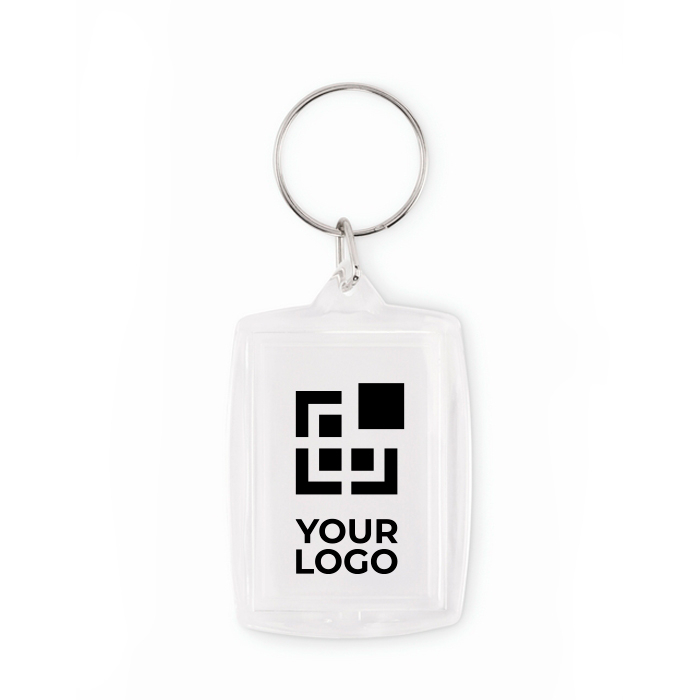 Porta-chaves de acrílico clássico com espaço para inserção de papel a cor bem garrida, pensado para incluir uma imagem, logo ou mensagem corporativa. Inclui janela interior para foto de 4,1 x 2,7 cm, o que facilita preparar desenhos normais e trocá-los quando for necessário. O formato é leve e prático para levar nas chaves, identificadores ou mochilas e permite personalização muito visível. Recomendado para campanhas de marca e eventos, boas-vindas de colaboradores ou ações de fidelização.