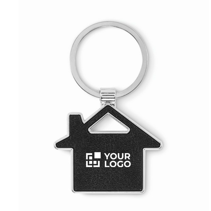 Porta-chaves metálico em forma de casa, de couro reciclado. É um brinde publicitário adequado para dar visibilidade a empresas do sector imobiliário.