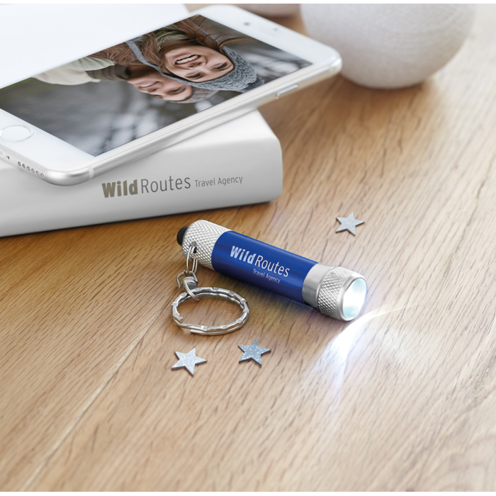 Este porta-chaves para brinde leva uma atrativa lanterna que está personalizada com o logótipo da empresa para oferecer como merchandising corporativo.