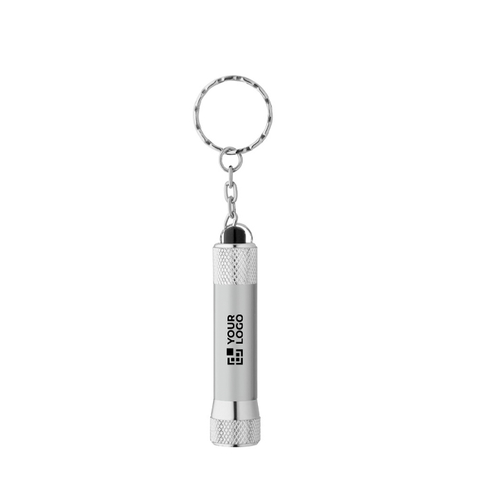 Porta-chaves de alumínio (92% reciclado) com lanterna de 3 luzes LED. Inclui 4 pilhas LR44.