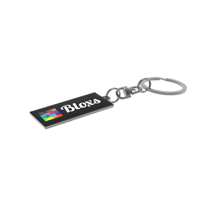 Porta-chaves metálico retangular com impressão a cor garrida nos 2 lados, dando visibilidade e presença à sua marca no dia a dia de clientes e colaboradores.
