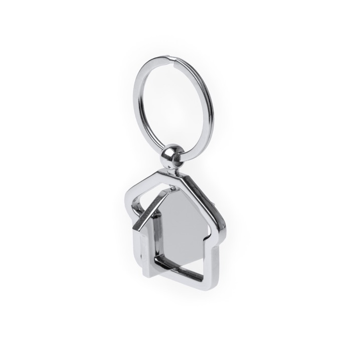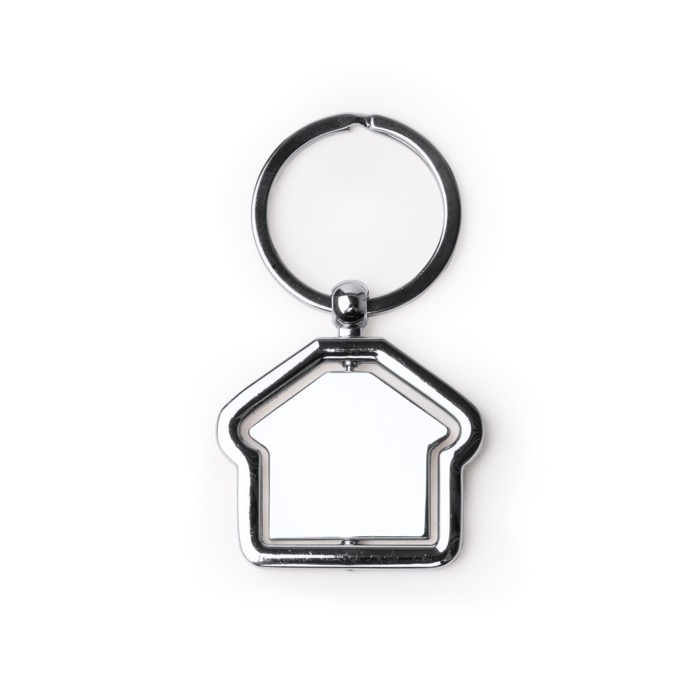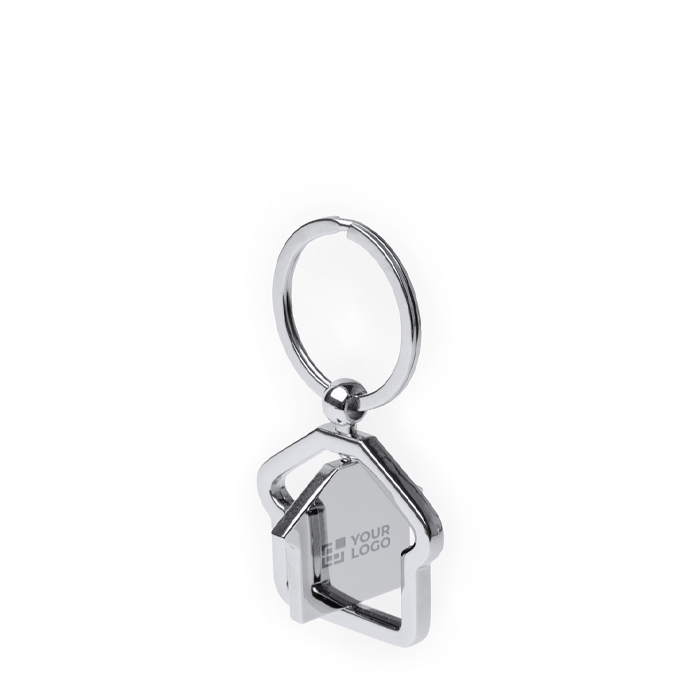 Porta-chaves metálico giratório com corpo em forma de casa que roda no seu eixo vertical. A estrutura combina uma moldura fixa com uma peça interior móvel, criando um efeito dinâmico quando o manuseia. Inclui uma área ampla pensada para marcação, facilitando a visibilidade do logótipo sem interferências da moldura. Pelo tamanho e resistência, é usado diariamente em chaves de escritório, de veículos ou de acessos. Opção prática para ações de captação, eventos do setor ou ofertas a clientes.