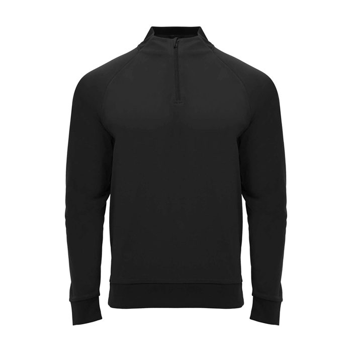 Camisola de tecido técnico. Mangas raglan. Forro interior. Gola com fecho central e costuras forradas e reforçadas a condizer. Canelado 1 x 1 na gola traseira, punhos e bainha. Etiqueta removível.