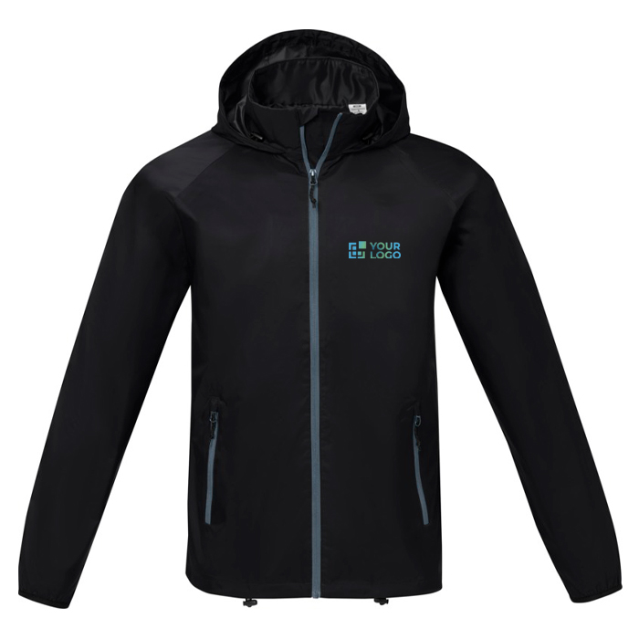 Opções interiores para personalizar marca. Etiquetas removíveis para maior conforto. Resistente à água até 500 mm. Mangas ranglan. Capuz dobrável. Fecho de correr invertido central. Bolsos frontais com fecho. Bolso interior. Cordão ajustável com fecho de cordão na bainha inferior e no capuz.