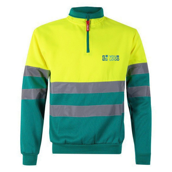 Camisola bicolor (300 g/m²) de felpa de poliéster (100%). Com gola alta e fecho central. Punhos e cós canelados. Faixas refletoras no tronco e mangas.