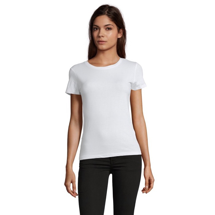 T-shirt de senhora em 100% algodão semi penteado ringspun de 150g / m², com gola redonda canelada em volta do pescoço, mangas curtas cortadas e costuradas, e costuras na parte interna da gola. Textura suave e personalização nítida.