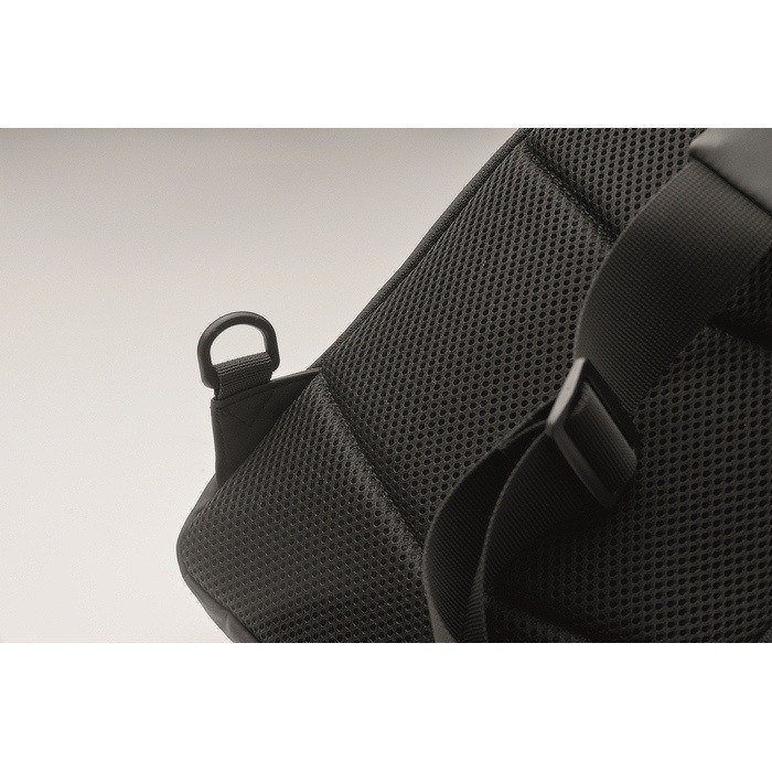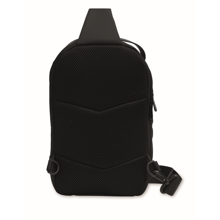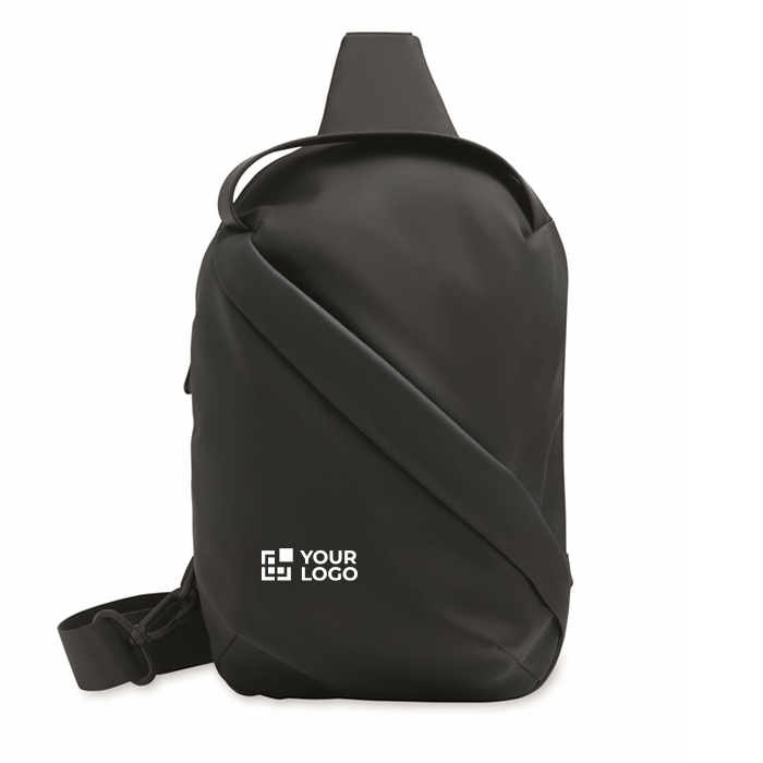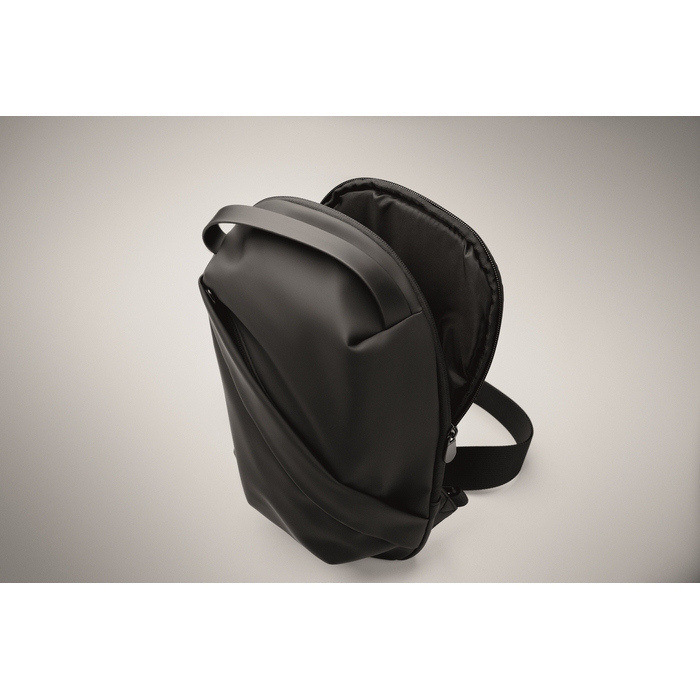 Bolsa tiracolo de PU macio com costas acolchoadas e forro de rPET 210D. Grande compartimento principal com bolso frontal e fecho de correr.