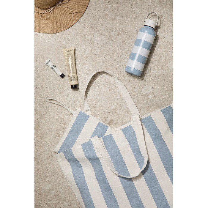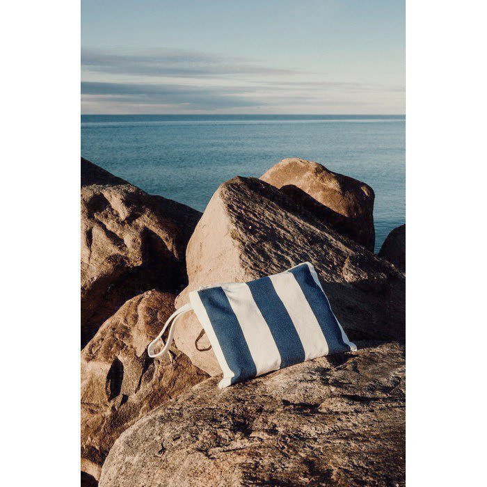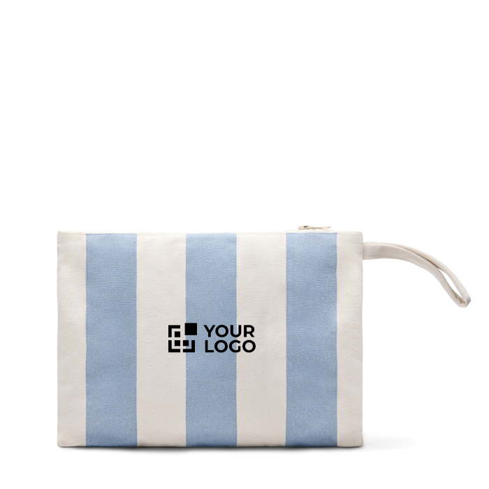Bolsa organizadora de lona de 390 g/m² com estampado de listras bicoloridas, desenhada para manter acessórios e pertences bem ordenados. Inclui fecho de correr para armazenamento seguro e uma tira prática que facilita o transporte no dia a dia ou durante deslocações. Feita de 69% de algodão reciclado e 29% de poliéster reciclado, conta com certificação GRS (Norma Global de Reciclagem) que assegura a cadeia de fornecimento de materiais reciclados. Útil como brinde empresarial em eventos, viagens de empresa ou ações de marca.