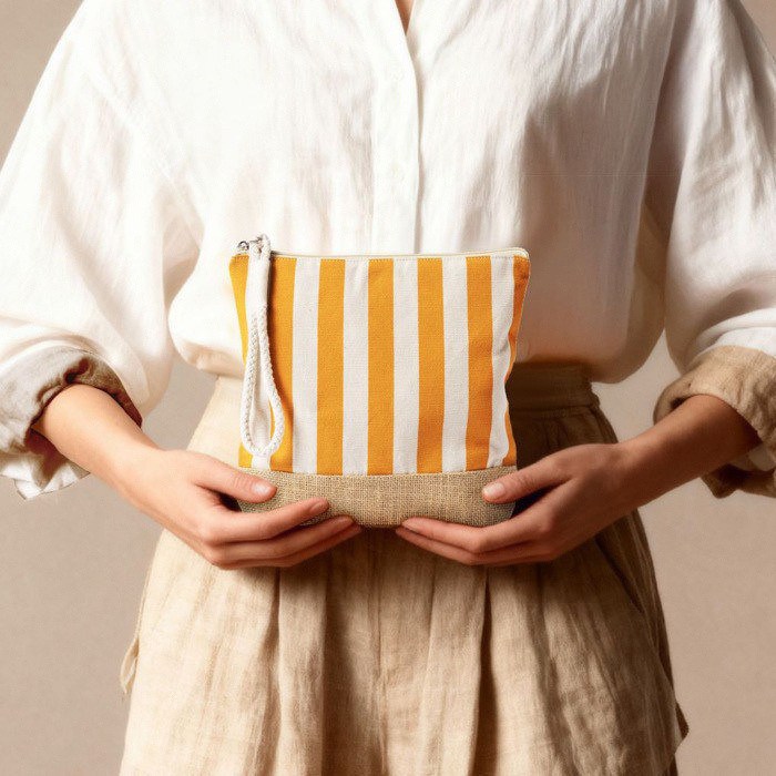 Necessaire às riscas em algodão e juta com cordão no puxador