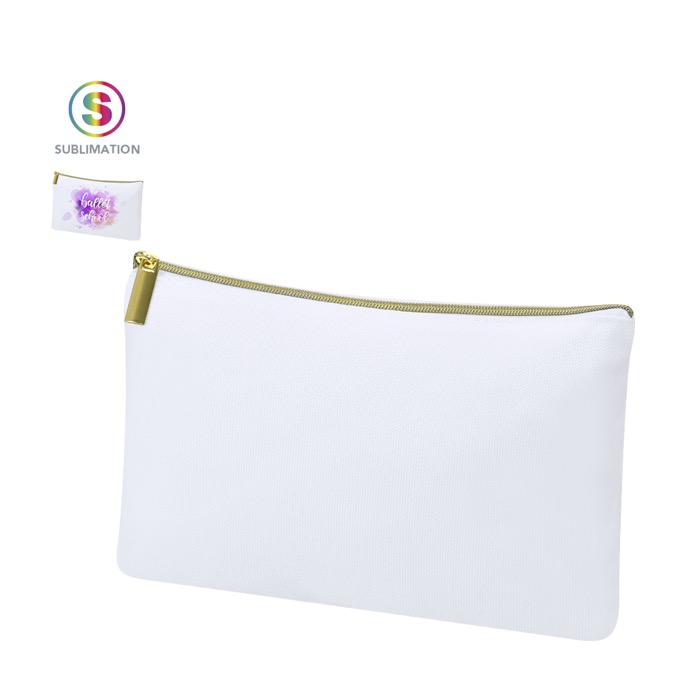 Nécessaire de poliéster com compartimento principal e fecho de correr dourado, rematado com puxador a condizer para uso confortável no quotidiano. O design foi pensado para sublimação, facilitando personalizações nítidas e constantes em produções corporativas. Formato prático para guardar acessórios, material de viagem ou pequenos essenciais de escritório, mantendo o conteúdo ordenado e acessível. Escolha útil para ações de marca em feiras, formações internas ou como brinde em campanhas de fidelização.