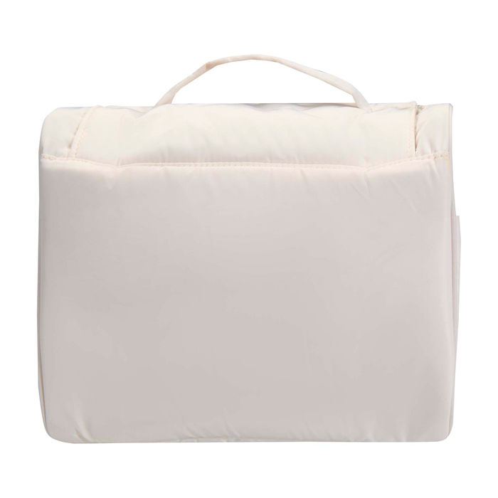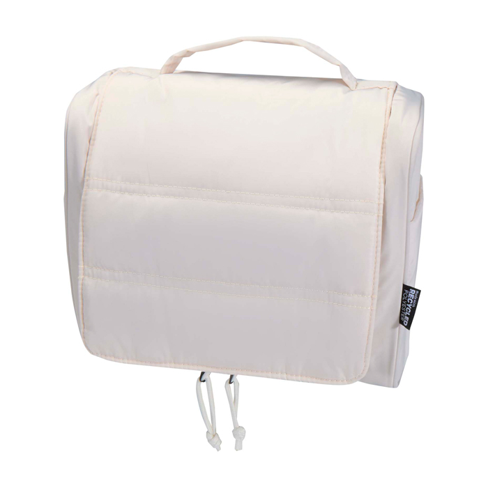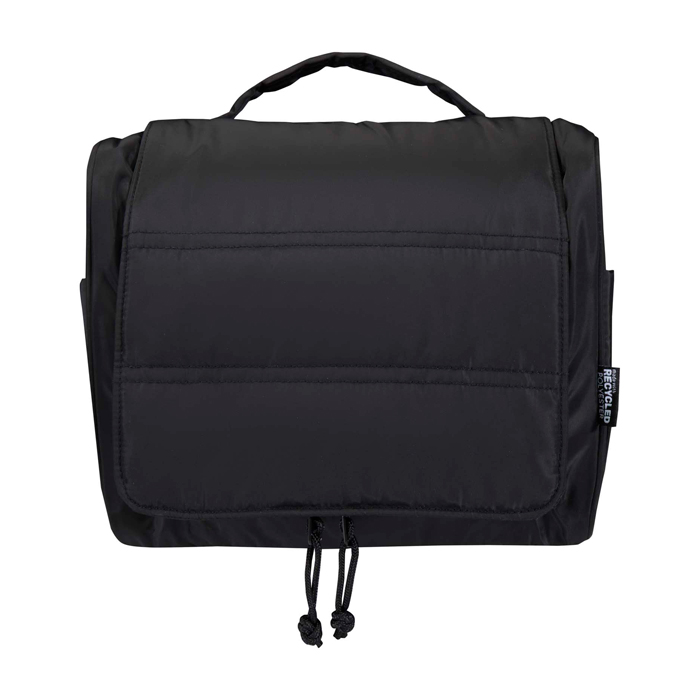 Nécessaire de poliéster reciclado com certificação GRS (Global Recycled Standard) e tira de pendurar incluída, desenhado para manter tudo em ordem durante viagens ou deslocações. Oferece 8 litros de capacidade e compartimento principal amplo com 6 bolsos interiores para separar acessórios, além de 2 bolsos laterais exteriores de acesso rápido. A tira permite pendurá-lo em portas ou toalheiros e a asa acolchoada melhora o transporte. O acabamento acolchoado dá-lhe proteção e o tecido repelente à água ajuda no uso diário. Útil para ações de marca em viagens corporativas e eventos.