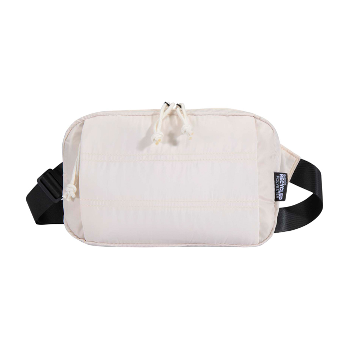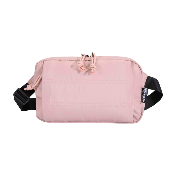 Bolsa de cintura de materiais reciclados com certificação GRS (Global Recycled Standard), projetada para uso diário em movimento. Dispõe de compartimento principal com fecho de correr e bolso interior para ordenar essenciais como o telemóvel, carteira e chaves. Inclui também um bolso frontal acolchoado com fecho de correr que adiciona segurança e acesso rápido. A correia ajustável com fecho de clique permite levá-la à cintura, ao ombro ou cruzada ao peito. Leve e repelente à água, é ótima para viagens, eventos e ações de marca.