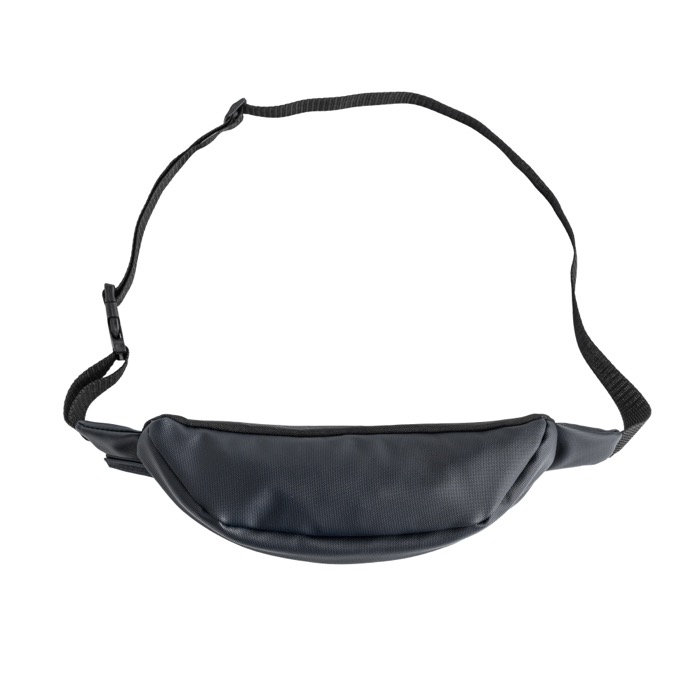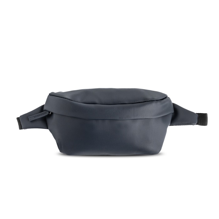 Bolsa de cintura fabricada em plástico reciclado com revestimento em pele sintética, concebida para uma utilização diária confortável e leve. Oferece proteção contra salpicos e um compartimento principal com fecho para manter os seus objetos pessoais bem guardados. Inclui ainda um bolso frontal que ajuda a separar o que precisa ter à mão, como chaves ou cartões. A fita ajustável permite adaptá-la a diferentes contornos e usá-la à cintura ou a tiracolo. Opção prática para ações de marca em eventos e atividades ao ar livre.