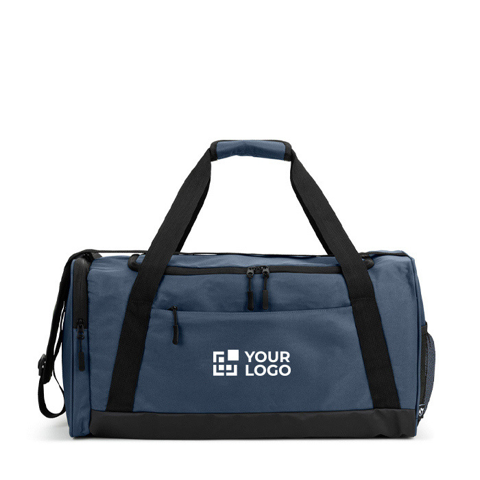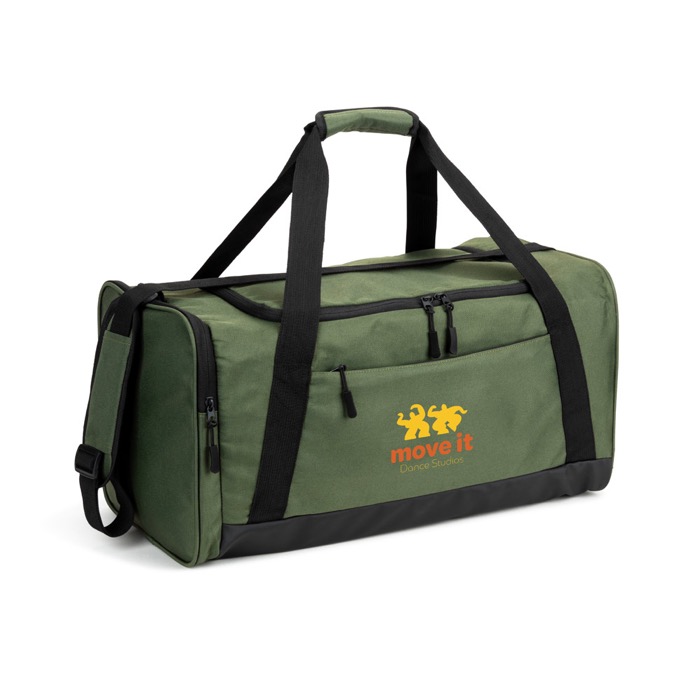 Saco desportivo em poliéster reciclado 600D de alta densidade, pensado para transportar equipamento e documentação de forma organizada. Inclui um compartimento principal amplo e um bolso interior com fecho de correr para guardar pequenos objetos pessoais com maior controlo. No exterior, acrescenta um bolso frontal com fecho de correr e dois bolsos laterais, um com fecho de correr e outro em malha, úteis para acessos rápidos. A alça de ombro ajustável incorpora um reforço acolchoado para utilização prolongada. Recomendado para kits de boas-vindas, eventos ou ações de equipa.