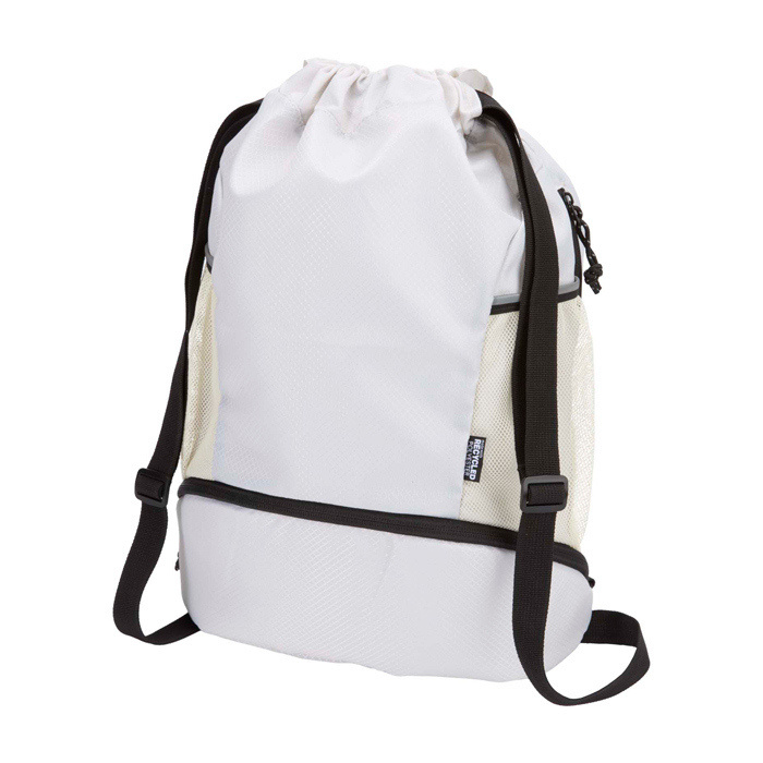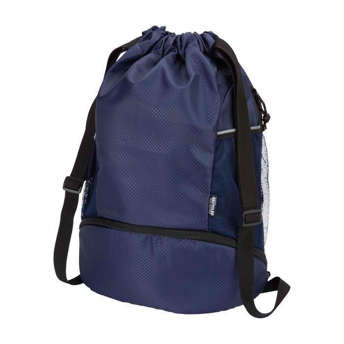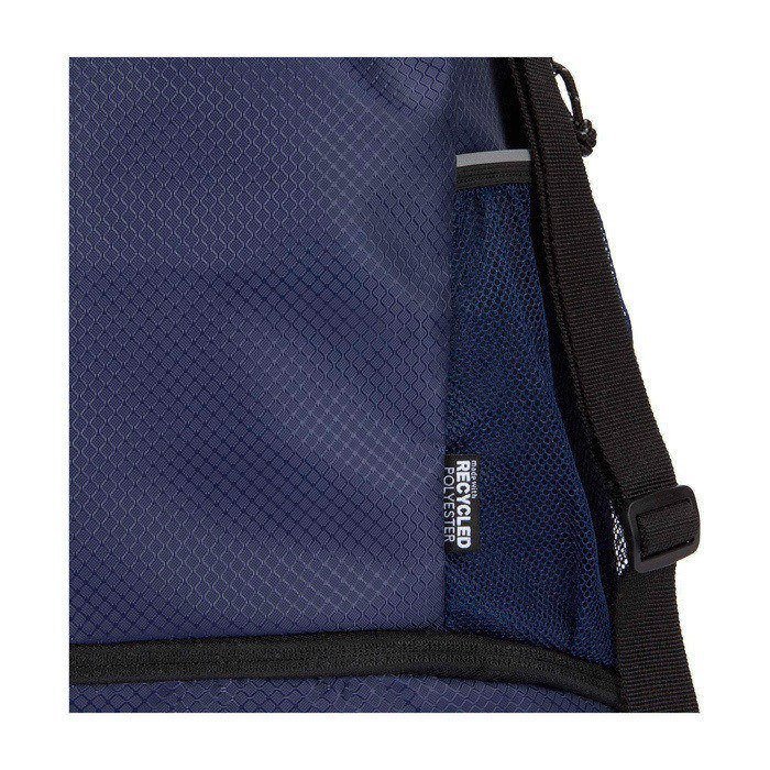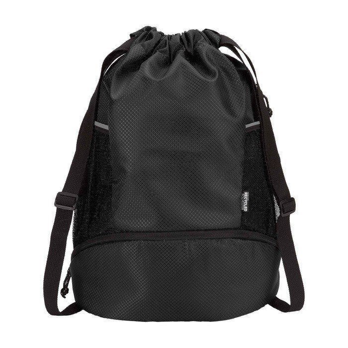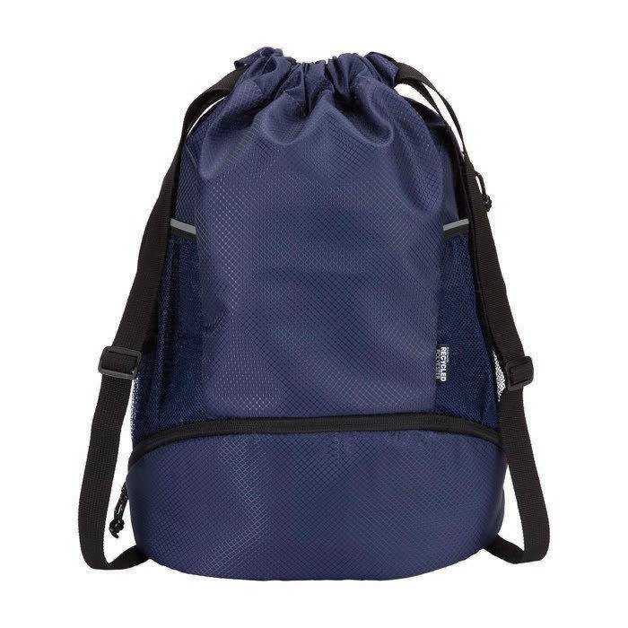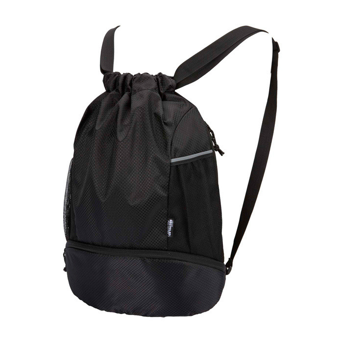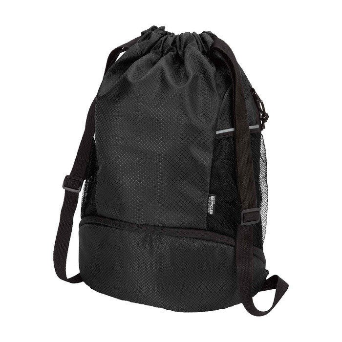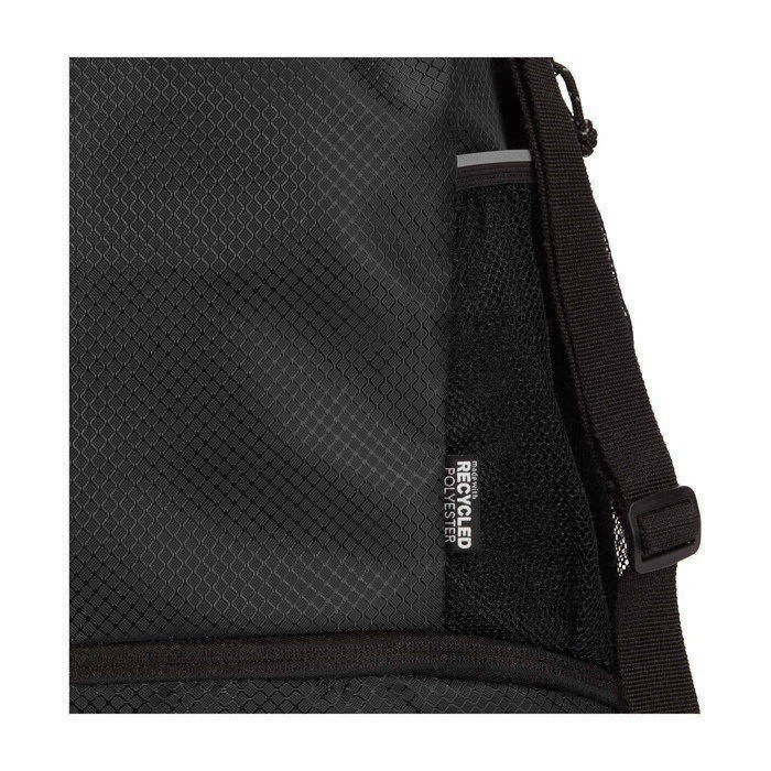 Mochila desportiva feita de tecido antirrasgos reciclado com certificação GRS, acabamento repelente à água, forro rPET com certificação GRS e elementos refletores. Pensada para um estilo de vida ativo, é adequada tanto para exercício diário como para atividades desportivas. Dispõe de: amplo compartimento principal com espaço para roupa, toalha ou até uma bola de basquetebol; compartimento inferior separado para calçado ou roupa usada; dois bolsos laterais de rede com elementos refletores; bolso oculto com fecho de correr para artigos de valor e alças ajustáveis para maior conforto no transporte.
