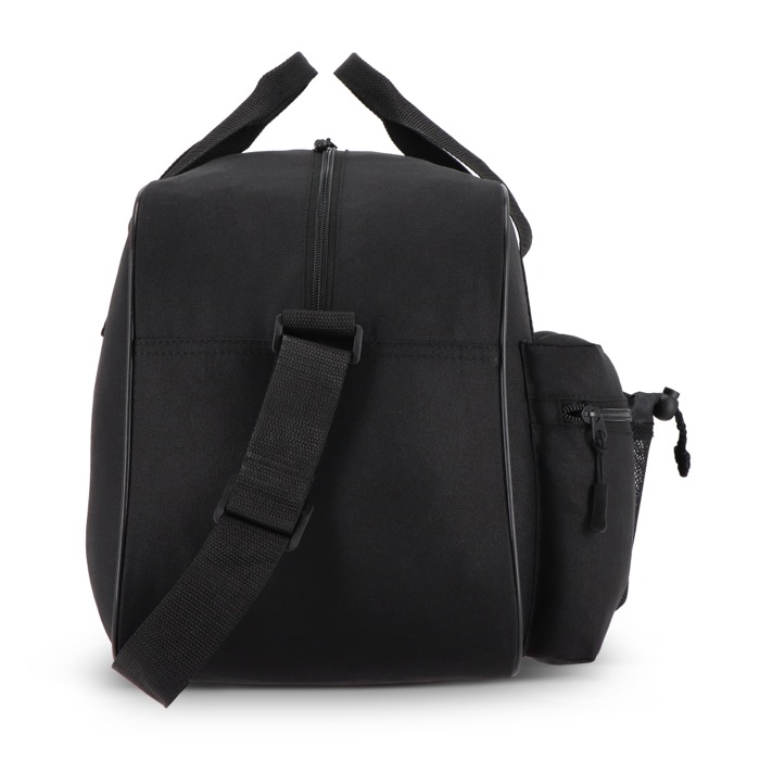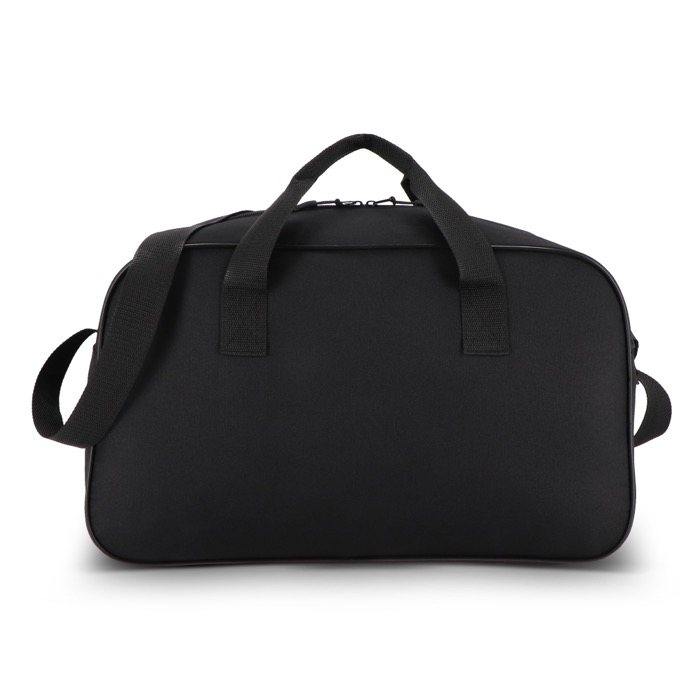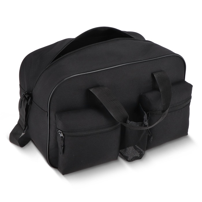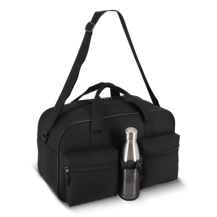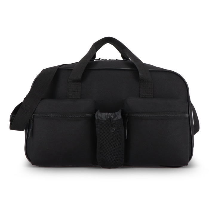 Saco desportivo e de viagem de plástico reciclado 600D, pensado para uso diário em deslocações, ginásio ou saídas de trabalho. Combina asas curtas com alça de ombro ajustável para se adaptar a rotinas diferentes. Inclui dois compartimentos frontais com fecho de correr, úteis para ter à mão chaves, documentação ou auriculares, e um bolso de rede para levar a garrafa separada do resto. Opção prática para ações de marca em eventos desportivos ou de bem-estar corporativo.
