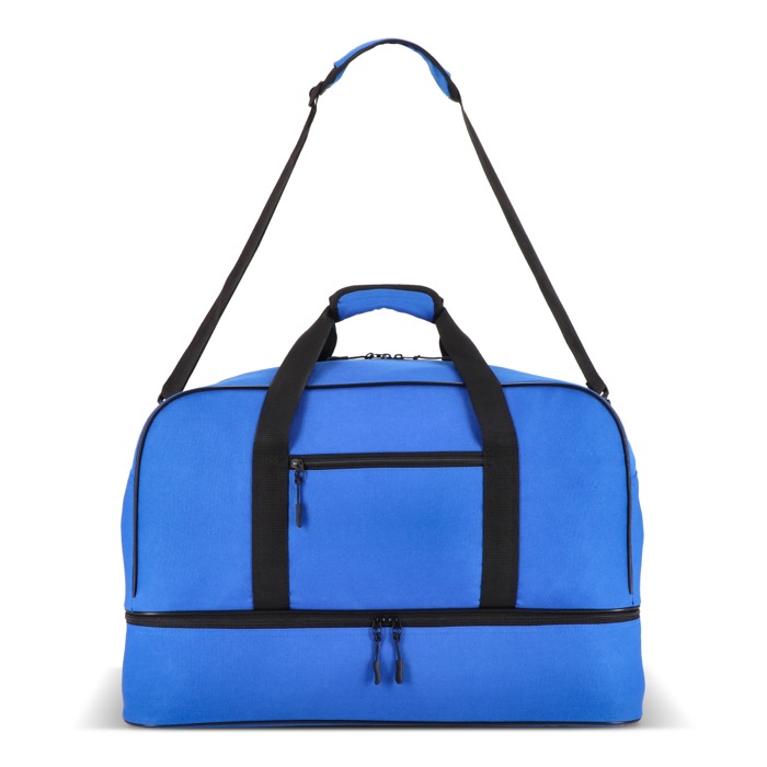 Saco de viagem ou desportivo de poliéster reciclado 600D, concebido para organizar equipamento e acessórios em dois compartimentos separados. Inclui asas curtas e alça comprida ajustável e amovível para o transportar confortavelmente. O bolso frontal com fecho de correr permite levar artigos pequenos e documentação. A base dura confere-lhe estabilidade ao pousá-lo no chão, mesmo carregado. É prático para separar roupa e toalhas húmidas ou calçado durante treinos, torneios e deslocações corporativas.