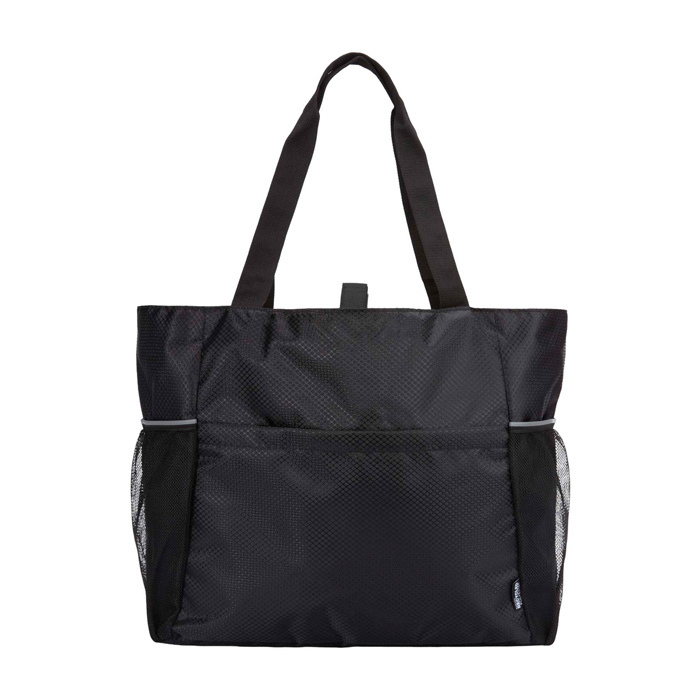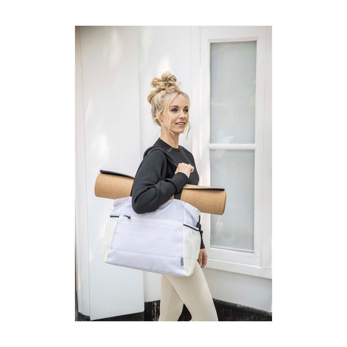 Saco tote de yoga feito de tecido antirrasgos reciclado com certificação GRS, acabamento repelente à água, forro rPET com certificação GRS e elementos refletores. Dispõe de: amplo compartimento principal com fecho de correr; vários bolsos organizadores interiores e exteriores; alças elásticas com fecho de velcro na parte superior para levar de forma segura um tapete de yoga ou de praia. Oferece espaço suficiente para levar toalha, garrafa de água, muda de roupa e artigos pessoais, tornando-o prático tanto para fazer exercício como para atividades quotidianas.