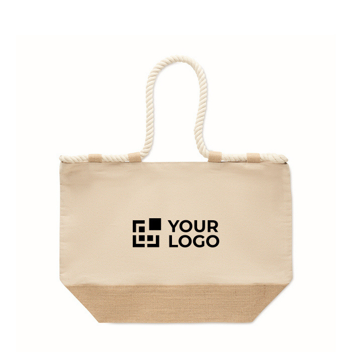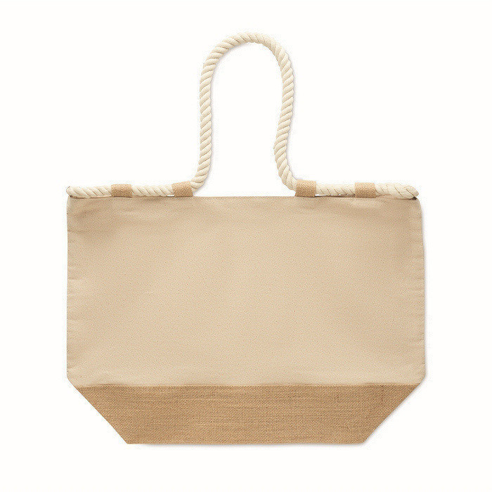 Saco de praia de lona de algodão de 280 g/m2 combinada com juta, pensado para uso intensivo no verão ou em eventos ao ar livre. Inclui asas de corda para uma pega confortável e fecho de correr para manter o conteúdo protegido durante a deslocação. A base revestida com juta dá maior resistência à estrutura e ajuda a manter a forma. Inclui 10 presilhas de juta como detalhe prático e decorativo. Escolha útil para packs de boas-vindas, campanhas sazonais ou merchandising corporativo.