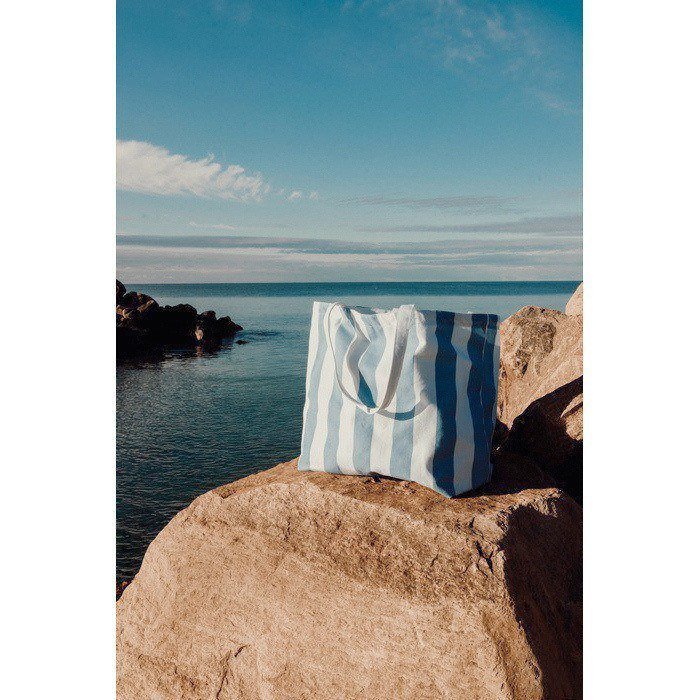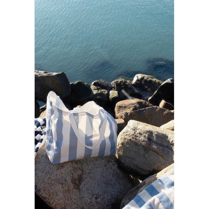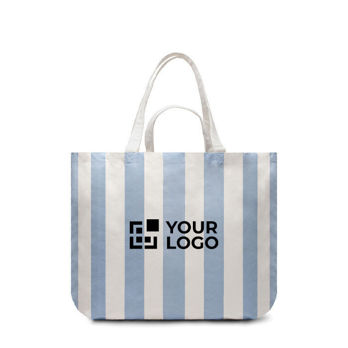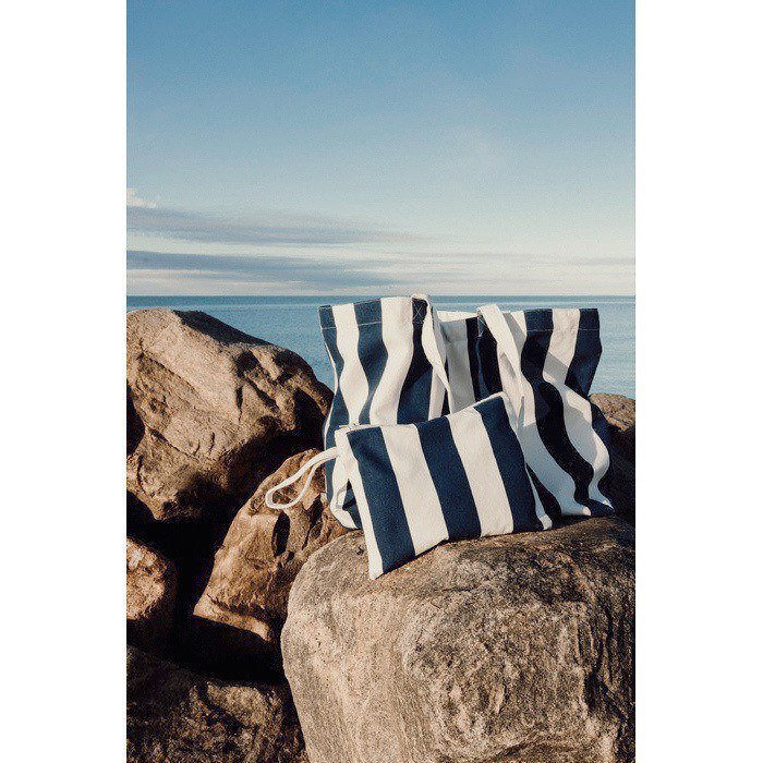 Saco de praia de lona grossa de 390 g/m², pensado para levar pertences ordenadamente em dias de eventos, viagens ou ações de marca. Combina alças de ombro com asas curtas, assim pode escolher o modo de transporte de acordo com o peso ou situação. Inclui estampado clássico de listras bicoloridas que encaixa em ambientes informais e corporativos. Feito de 69% de algodão reciclado e 29% de poliéster reciclado, conta com certificação GRS (Norma Global de Reciclagem). Útil como brinde em campanhas de verão ou campanhas internas de boas-vindas.