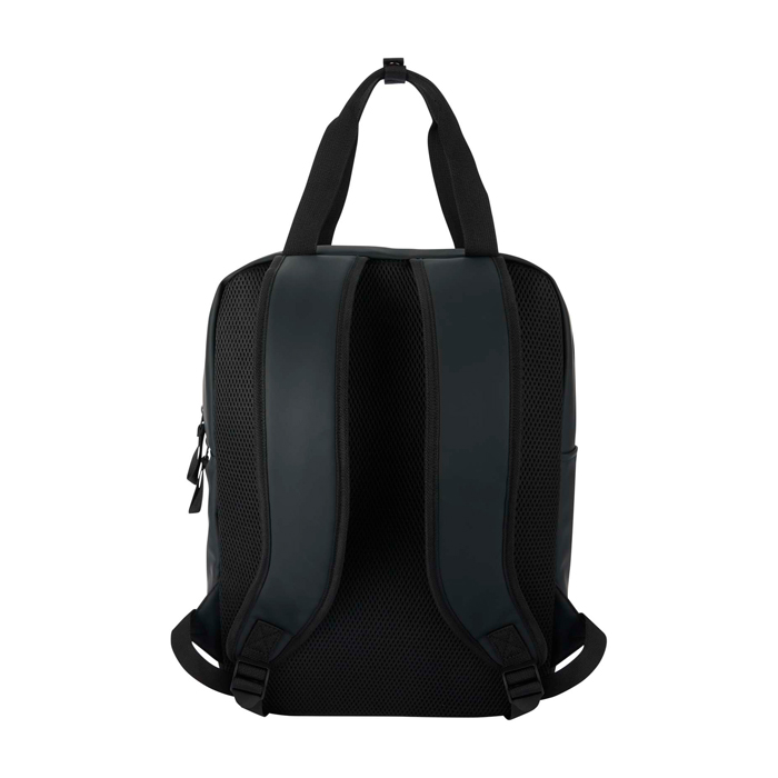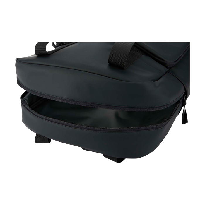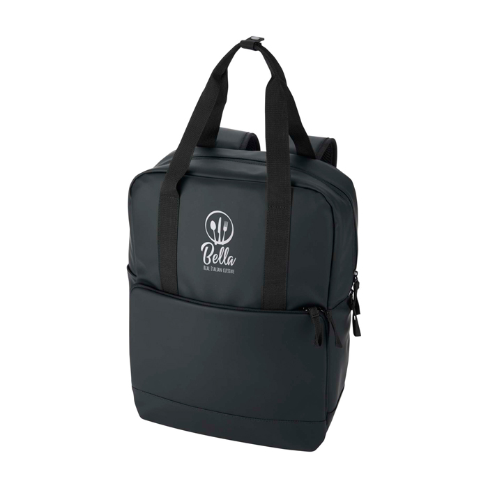 Mochila térmica de pele sintética reciclada com certificação GRS (Global Recycled Standard) e forro de plástico reciclado a condizer, pensada para deslocações e atividades ao ar livre. O compartimento principal isolado mantém frias as comidas e bebidas e inclui presilhas elásticas para prender uma garrafa de vinho com segurança. Dispõe também de bolso frontal acolchoado com fecho de correr para guardar objetos delicados e bolso lateral aberto para acesso rápido. As costas com malha transpirável e alças ajustáveis melhoram o conforto. Úteis para ações de marca em eventos, praia ou viagens de empresa.