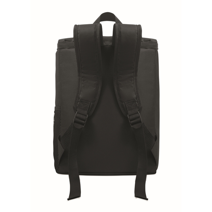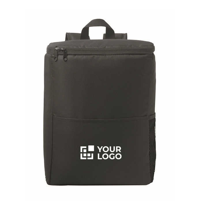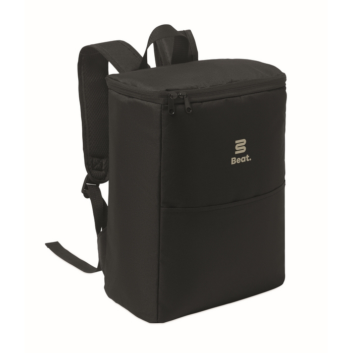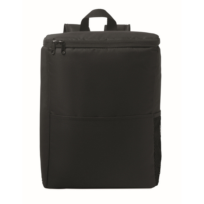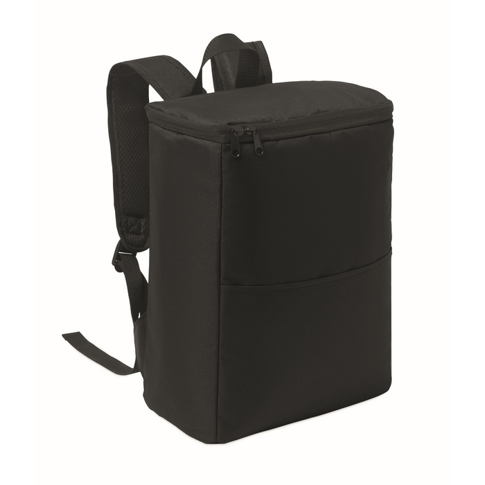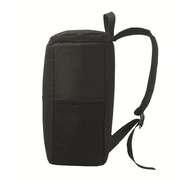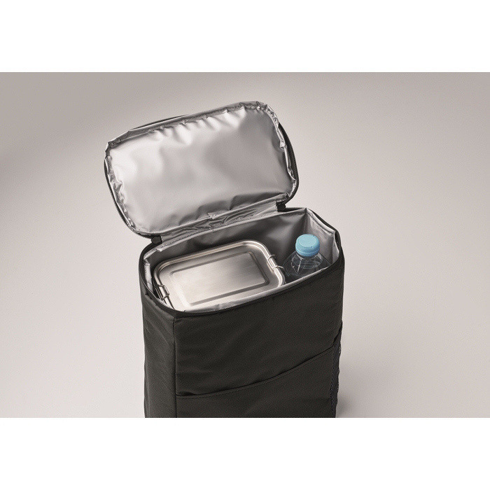 Mochila térmica de poliéster rPET 600D com capacidade de 11 L, desenhada para transportar comida e bebida ordenadamente. Conta com alça de ombro ajustável e acolchoada para um transporte mais confortável. Dispõe de um bolso lateral de malha com fecho de correr e bolso frontal para acessórios. Contém forro isolante de PEVA e espuma de PE de 13 mm para melhorar o isolamento. Útil para ações de boas-vindas, eventos ou equipas em movimento.