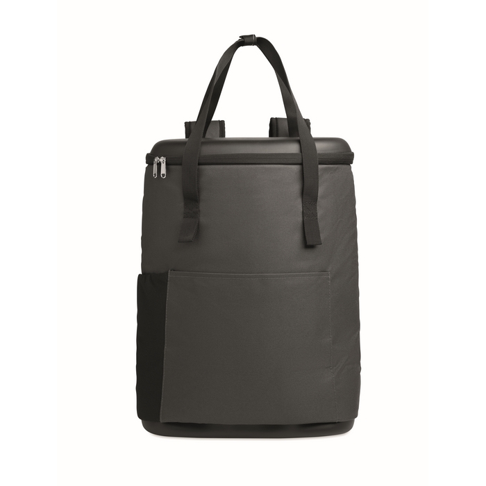 Mochila térmica de rPET 600D, repelente à água, com isolamento de espuma de PE e forro de PEVA. Dispõe de costas com malha acolchoada para um transporte mais confortável em deslocações. O bolso frontal com fecho de correr ajuda a organizar acessórios e os bolsos laterais permitem ter garrafas ou pequenos objetos à mão. Com capacidade de 20 L, é prática para eventos, dias de trabalho em equipa ou packs corporativos para o exterior.