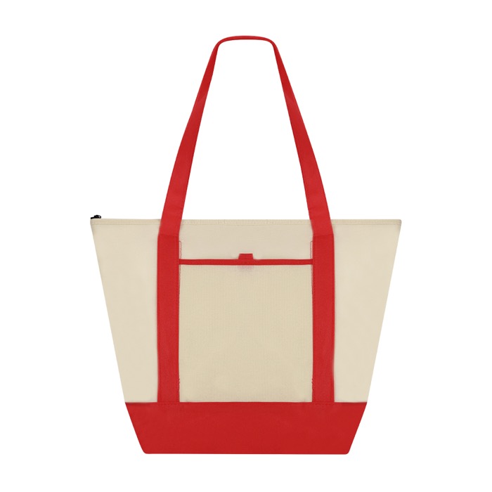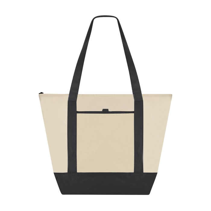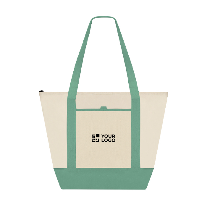 Saco térmico de tecido non-woven, desenhado para transportar comida e bebida em deslocações curtas. Inclui fecho de correr para manter o conteúdo protegido e interior com acabamento de alumínio para conservar a temperatura durante mais tempo. As asas médias reforçadas de 60 cm facilitam o transporte e o fole na base dá-lhe capacidade extra e melhor apoio. Dispõe de bolso frontal aberto para acesso rápido e aguenta até 5 kg. Opção prática para ações de marca em feiras, escritórios ou eventos.