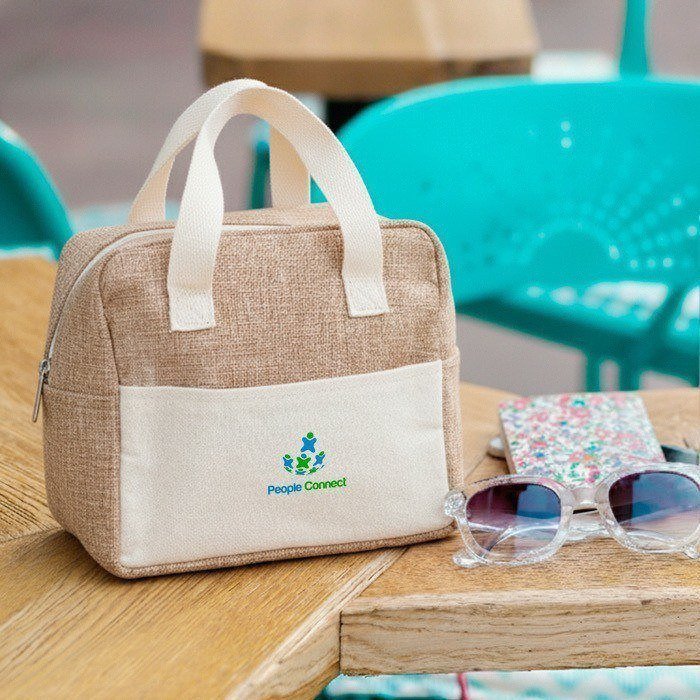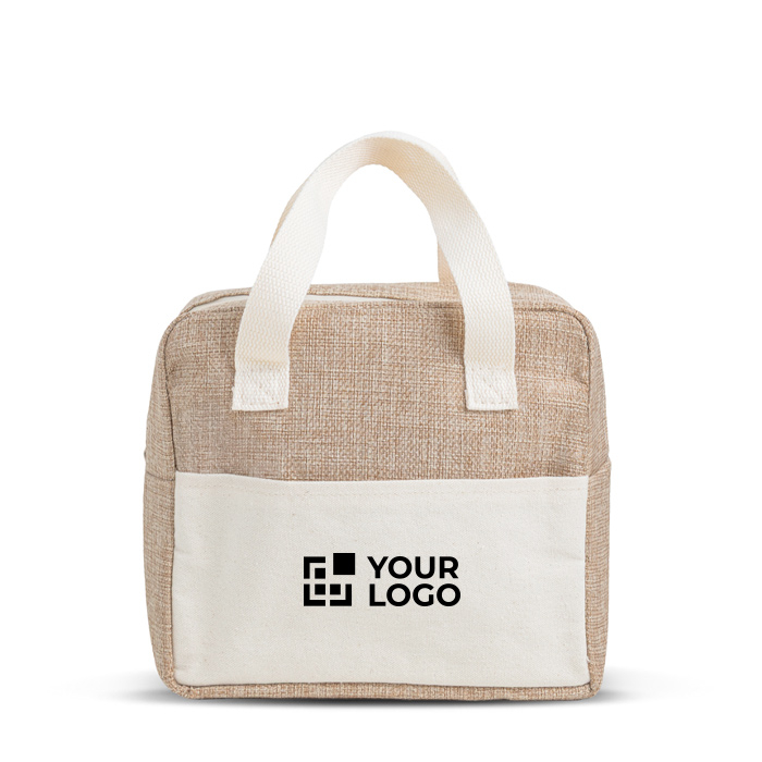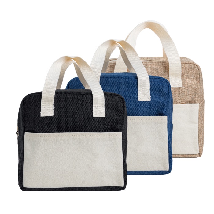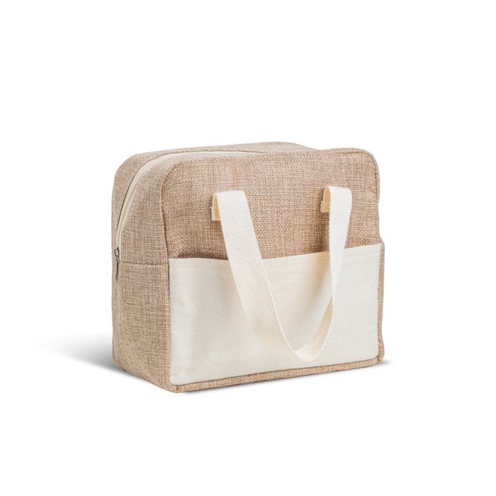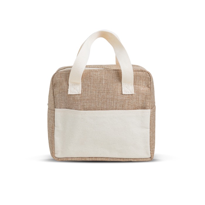 Saco térmico em poliéster e algodão com interior em alumínio para melhorar o isolamento e ajudar a manter alimentos e bebidas à temperatura adequada. Inclui asas curtas resistentes para um transporte confortável em trajetos curtos e um design em tons neutros fácil de integrar no dia a dia. Suporta até 4 kg, pensado para marmitas, fruta ou latas sem complicações. Uma opção prática para ações de branding no escritório, em eventos e em campanhas de verão com o seu logótipo.