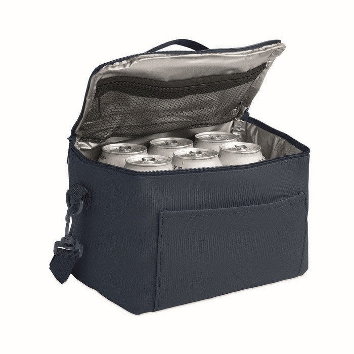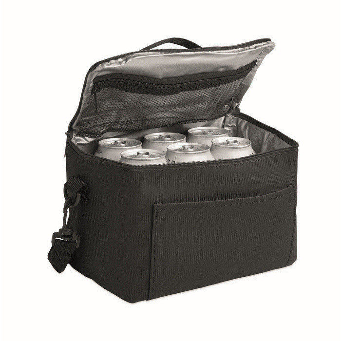 Saco térmico de PU com forro interior de poliéster rPET de 100 g, pensado para transportar comida e bebida no dia a dia. Inclui 1 bolso frontal para acessórios ou guardanapos, além de asa superior e alça para o ombro para facilitar o transporte. O isolamento é constituído por espuma de PE e forro de PEVA, ajudando a manter a temperatura. Capacidade de 5,5 L, útil para ações de boas-vindas ou eventos corporativos.