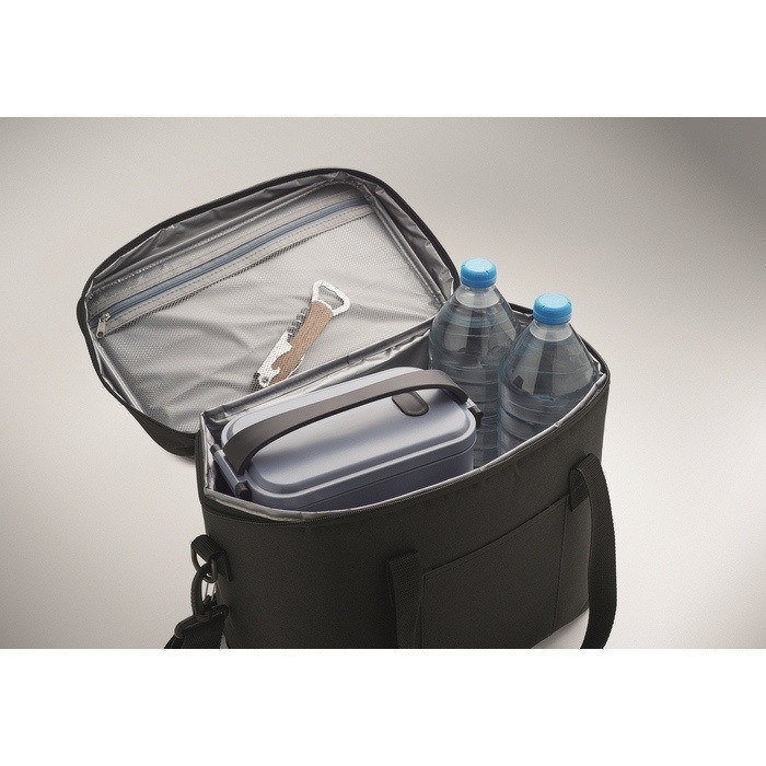 Saco térmico de rPET 600D com revestimento de PU, pensado para transportar refeições e bebidas mantendo a temperatura. Inclui forro isolante de PEVA com espuma de PE de 6 mm para melhorar o isolamento. Conta com 1 bolso frontal para acessórios e 1 interior de malha para organizar melhor o conteúdo. Inclui 2 pegas e 1 alça tiracolo ajustável para a levar confortavelmente em movimento. Capacidade de 18 L, útil para a praia ou packs de eventos.