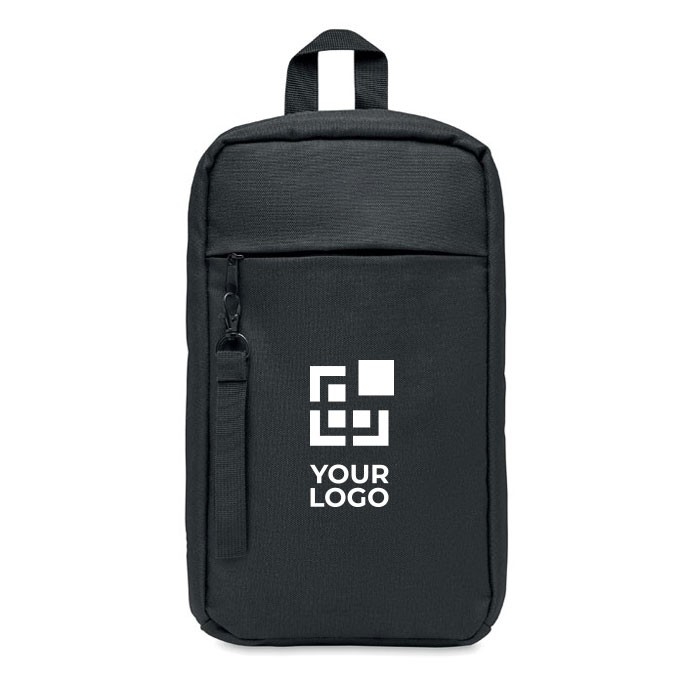 Saco tiracolo em poliéster RPET 600D. Compartimento principal acolchoado com bolso de malha RPET e bolso frontal com fecho de correr. Alça ajustável e asa independente.
