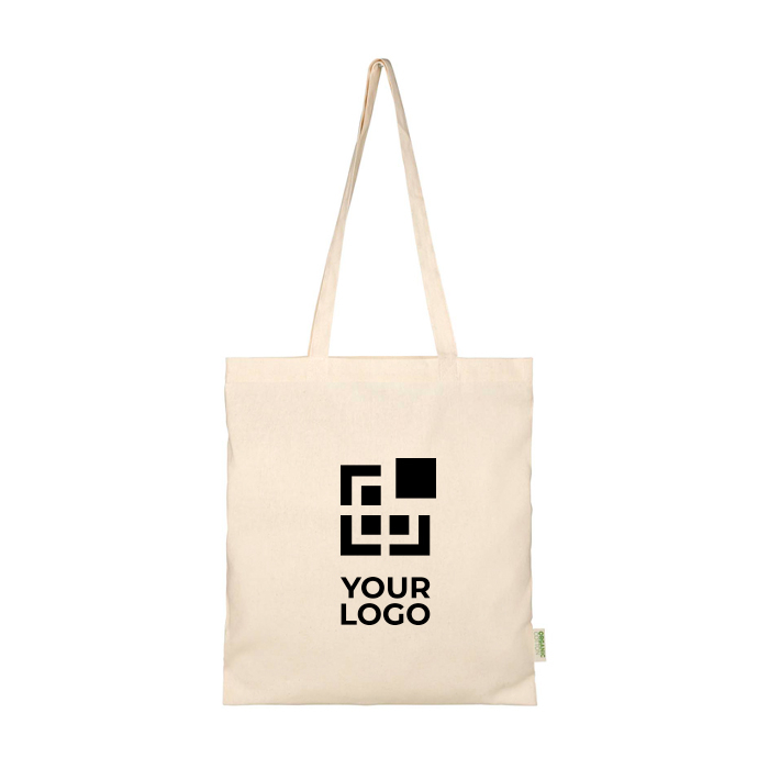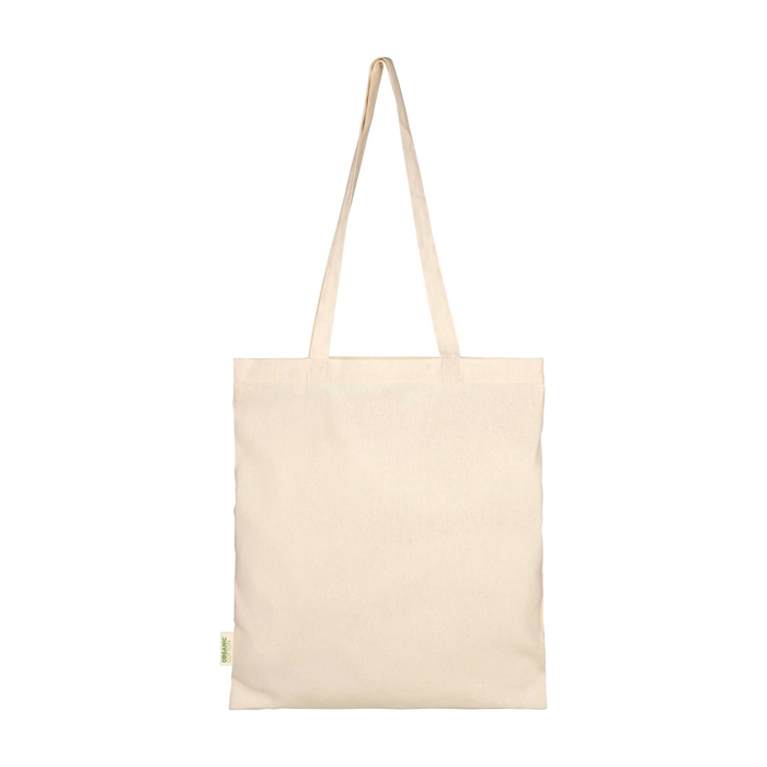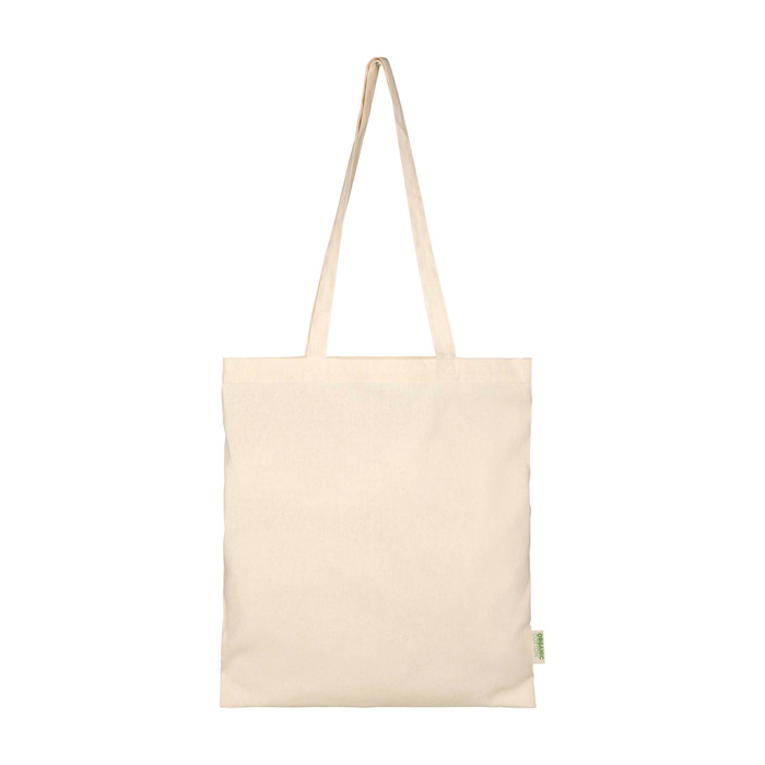 Saco tote de algodão orgânico com tecido de 100 g/m2 e certificação OCS (Organic Content Standard). Dispõe de compartimento principal aberto e amplo, desenhado para transportar documentos, material de evento ou compras do dia a dia sem problemas. As asas de 32 cm conferem-lhe um transporte cómodo ao ombro ou à mão, facilitando o uso contínuo. Aguenta até 5 kg e dispõe de capacidade de 7 L, útil para ações de boas-vindas, feiras e entregas de merchandising com logo.