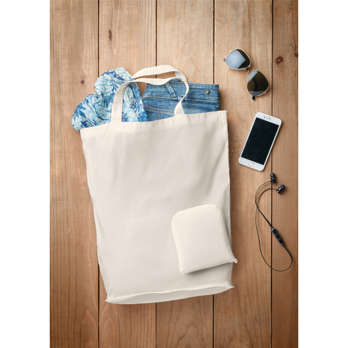 Sacola de compras dobrável em algodão com alças curtas. 135 gr / m². Fornecido desdobrado.