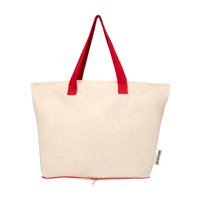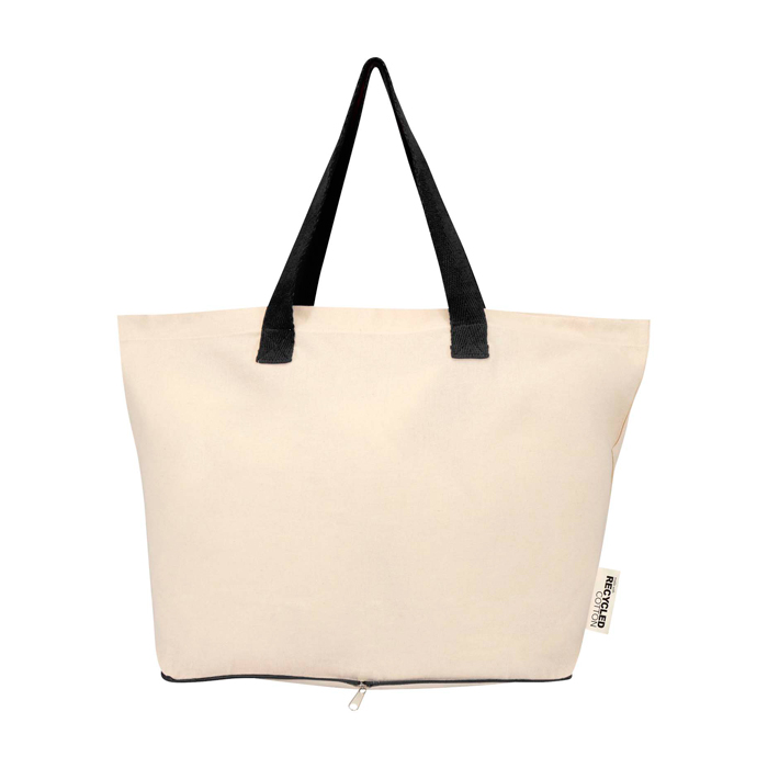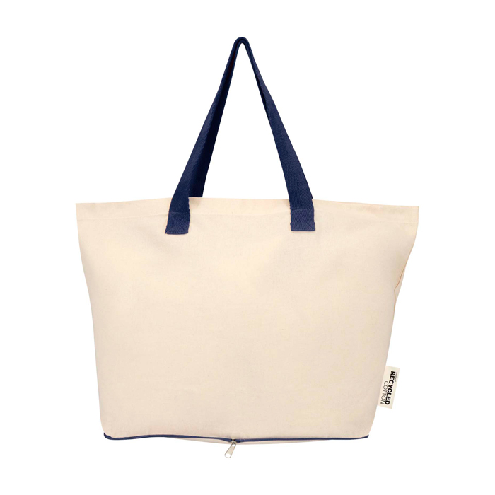 Saco tote dobrável de algodão 100% reciclado com certificação GRS (Global Recycled Standard) de 140 g/m2, projetado para uso diário com boa resistência e manuseamento cómodo. Dobra-se no próprio bolso com fecho de correr situado na parte inferior, ocupando pouco espaço para o transportar num saco, carro ou maleta. Inclui asas duplas para uma pega mais segura ao transportar peso e aguenta até 10 kg. Capacidade de 7 litros. Recomendado para ações de marca em feiras, compras corporativas ou boas-vindas a colaboradores.