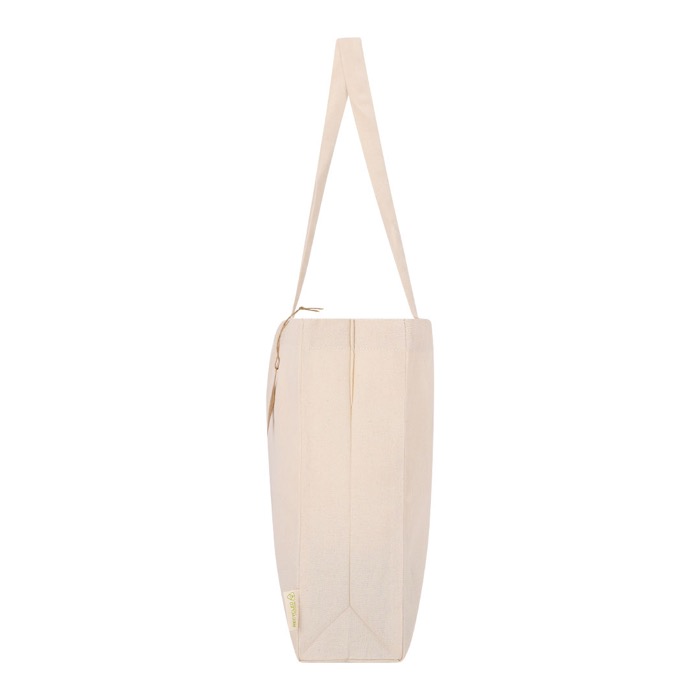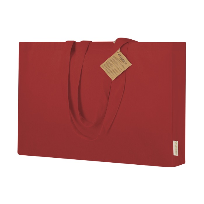 Saco com fole na base e laterais, feito principalmente de algodão reciclado de 220 g/m² para uso repetido no quotidiano. Dispõe de asas compridas reforçadas de 70 x 2,5 cm, pensadas para o levar ao ombro com mais conforto e durabilidade. Inclui selo de algodão reciclado para identificar o material de fabrico. Oferece resistência até 10 kg de carga. Adequado para feiras, formações ou entregas de material corporativo no escritório.