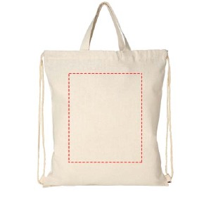 Mochila com cordões de 210 g/m2, resultante da combinação de algodão e poliéster. O algodão reciclado é produzido a partir de resíduos pré-consumo gerados pelas fábricas têxteis durante o processo de corte. Grande compartimento principal com fecho de cordão em algodão. Possui duas alças com um comprimento de 14 cm. Resistência até 5 kg de peso.